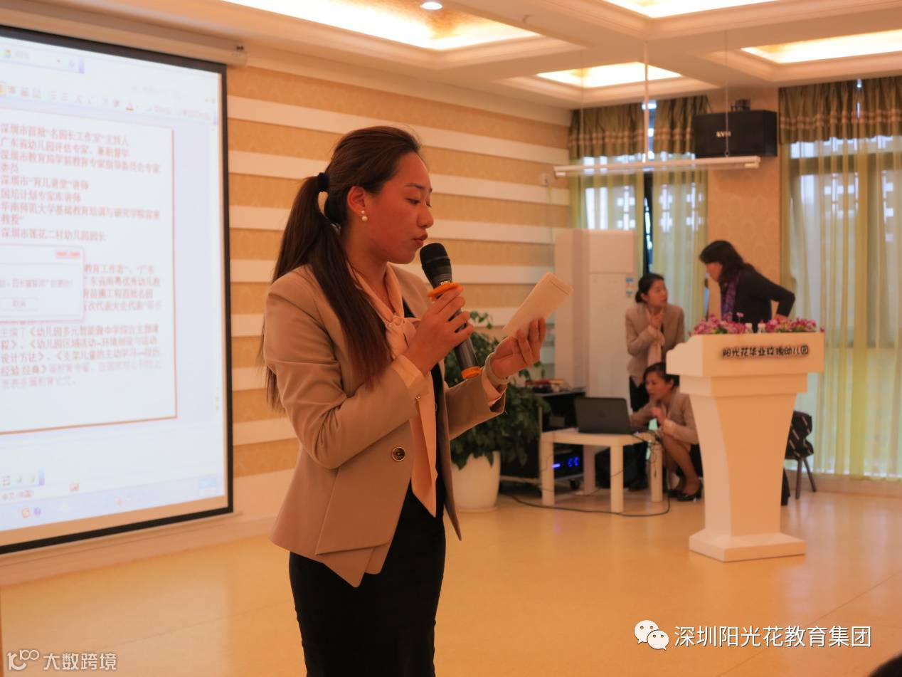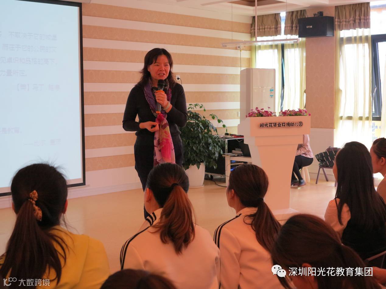 今天,北京师范大学硕士研究生、中国未成年人家庭教育高级指导师、中国儿童研究中心特邀研究员、广州外语艺术职业学院客座教授、中国教育精英联盟理事会副理事长、深圳市学前教育协会副会长,也是阳光花教育集团的校董王英女士为我们带来落地的讲座《阳光化文化篇》。