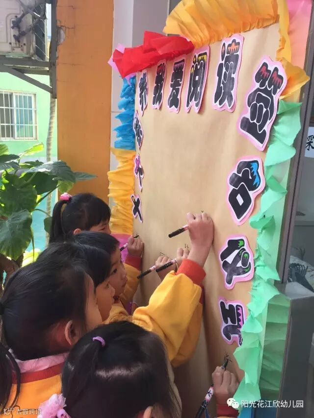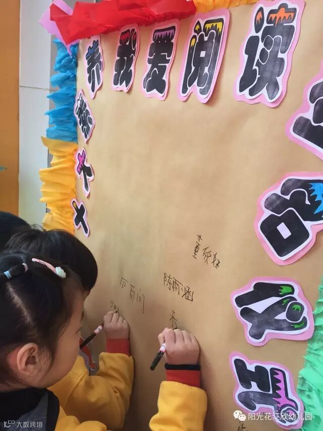 读书有益,我们要继承和发扬这个传统,由大班幼儿代表认真的在“我爱阅读”签名版上签下自己的姓名,从这一刻起我们将走进书的世界,在知识的海洋里快乐成长。