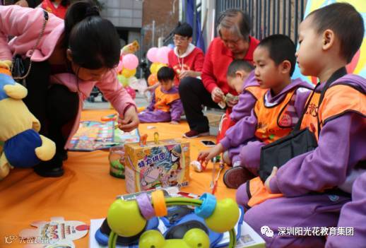 今天接园时间显得热闹非凡,俨然一副小商品市场的阵势。一排排的摊位上,大型铲车、米老鼠、布娃娃、图书、铠甲勇士、恐龙等物品简直是应有尽有。