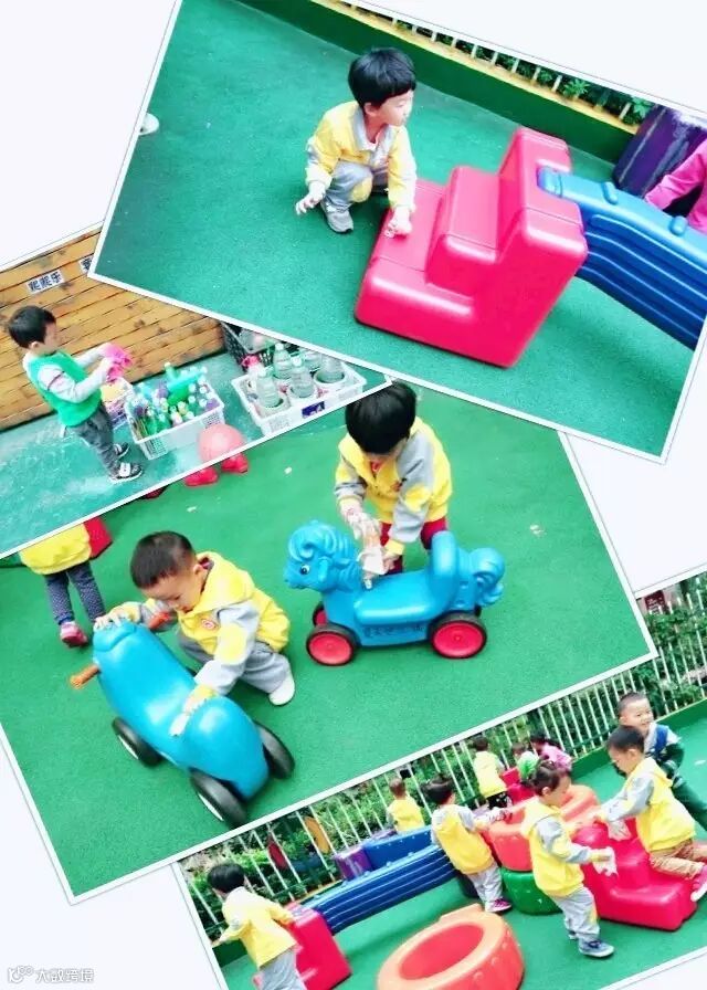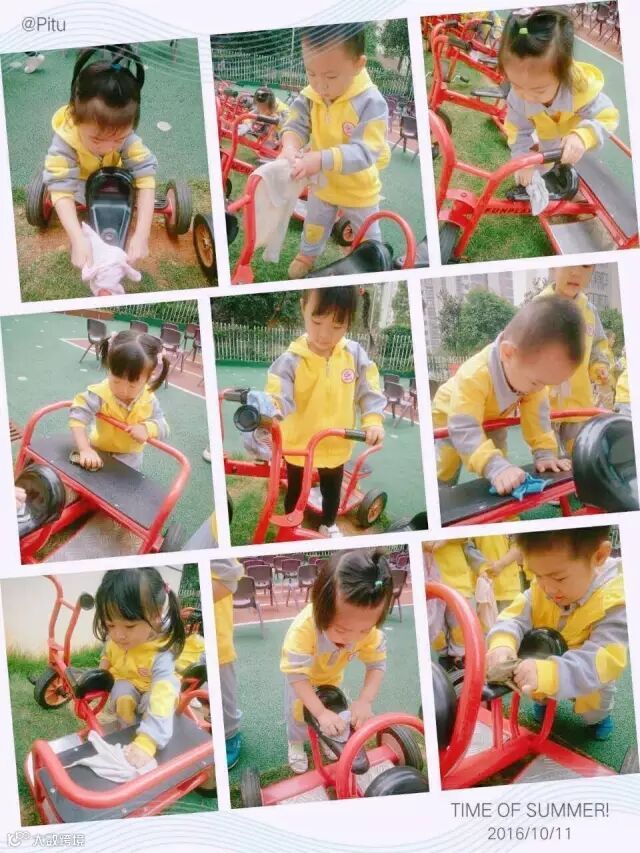活动结束之后,小班组清洁了幼儿园的玩具、栏杆;让我们的幼儿园变得更干净吧!上擦擦、下擦擦、左擦擦、右擦擦;