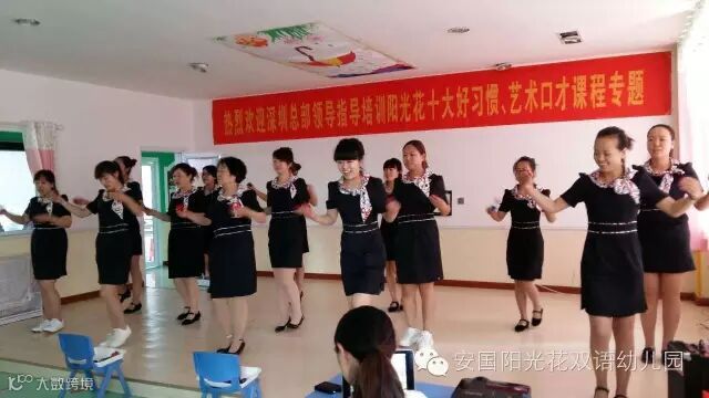 开园庆典隆重召开,借着庆典的东风,深圳阳光花教育集团领导对安国分部两所园六十多位教职工进行了十大好习惯、艺术口才课程的专题培训。我们的园舍环境上档升级国际化,那我们的教学水平也要上新台阶,从下午一点半一直持续到晚上九点多的学习,让我们开阔了思路,新做法新技巧会很快运用到我们的教学中。亲爱的孩子们,期待老师们更加精湛的教学艺术吧!