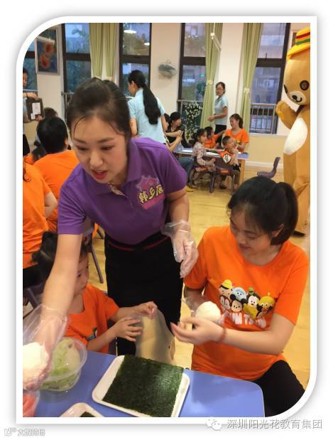 热烈的掌声、满面的笑容,充分地表达了宝贝们此刻的心情。“韩乡居”的李阿姨精心地做了准备,不但准备了精美的食材,讲了寿司的制作方法、注意事项等方面进行了精炼的讲解,阿姨示范完,爸爸妈妈和宝贝们就立刻动手做起来。