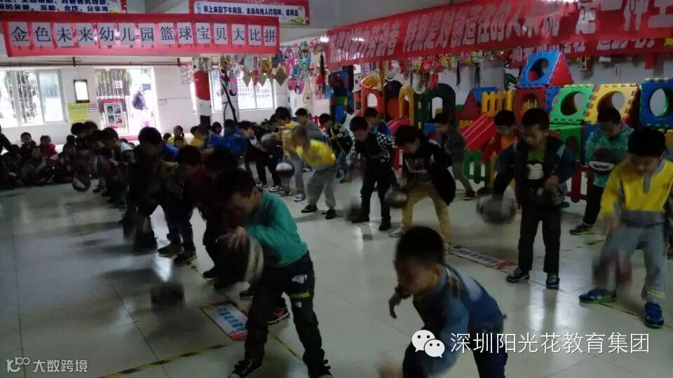 阳光花金色未来幼儿园2015年12月3日上午全园开展了《篮球宝贝大比拼》拍球活动。 冬季的到来,些许幼儿因身体素质较低会引发多种疾病降临,针对这一现象本学期特进行篮球锻炼活动,其次幼儿学打篮球首先要学会拍球,拍球有以下对幼儿终身受益的方面: