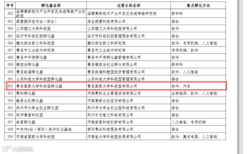 近日,国家工业和信息化部发布《关于工业和信息化部科技型企业孵化器(第一批)名单的公示》,青岛国家大学科技园历经层层遴选和严格审核,凭借一系列硬核指标脱颖而出,成功入选,再添一块国家级“金字招牌”。作为青岛市首批国家级大学科技园,此次成功认定标志着青岛国家大学科技园正式跻身国家级创新孵化平台双“国家队”序列。