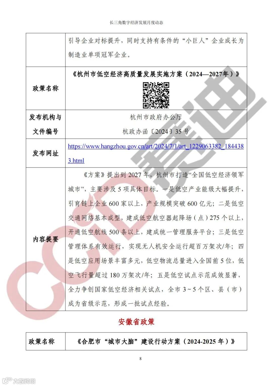 浙江省出台《关于进一步促进专精特新中小企业高质量发展的若干意见》,意见支持企业“三新一强”,即打造新动能、攻坚新技术、开发新产品和强化产业链配套能力,帮助更多专精特新企业进入产业链供应链体系。杭州市发布《杭州市低空经济高质量发展实施方案(2024—2027年)》,提出到2027年,杭州市打造“全国低空经济领军城市”,主要涉及低空产业能级大幅提升、低空交通网络基本成型、低空管理体系有效运行、低空应用场景丰富多元、低空试点示范成效显著5项具体目标。安徽省出台《合肥市“城市大脑”建设行动方案(2024-2025年)》,提出合肥市“城市大脑”2.0建设期间,将聚焦完善基础设施支撑、深化数据资源综合利用、打造智慧高效的数字应用等3类任务,进一步发挥部门合力推进综合性、跨部门场景建设,切实增强群众在智慧城市建设方面的获得感和幸福感。