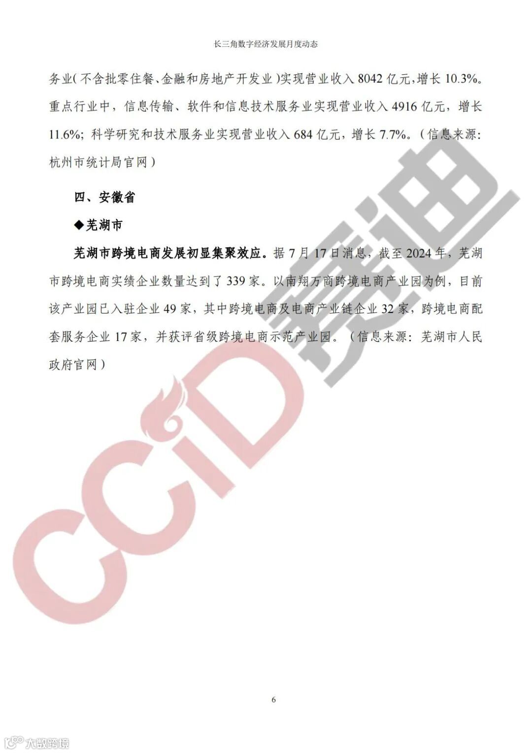 长三角数字经济平稳增长。上海市数字经济发展向好,上半年信息传输、软件和信息技术服务业增加值2514.04亿元,增长13.4%;集成电路增长19.2%。相关产品产量较快增长,全市锂离子电池、集成电路、3D打印设备和服务器产量同比分别增长27.1%、20.7%、16.6%和13.4%。江苏省南京市新兴产业较快发展,南京市1-4月信息传输、软件和信息技术服务业增长6.4%,比1-3月提升0.9个百分点,互联网广告服务营业收入增长32.7%,信息系统集成和物联网技术服务营业收入增长15.9%。浙江省上半年信息传输、软件和信息技术服务业增长9.4%;杭州市1-5月信息传输、软件和信息技术服务业实现营业收入4916亿元,增长11.6%。安徽省芜湖市,截至2024年跨境电商实绩企业数量达到了339家。