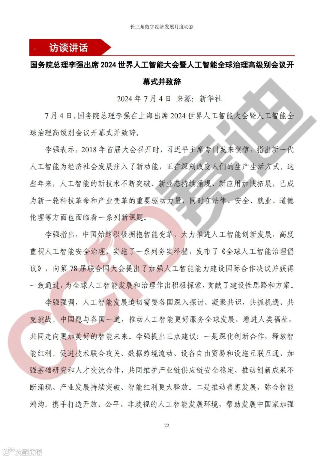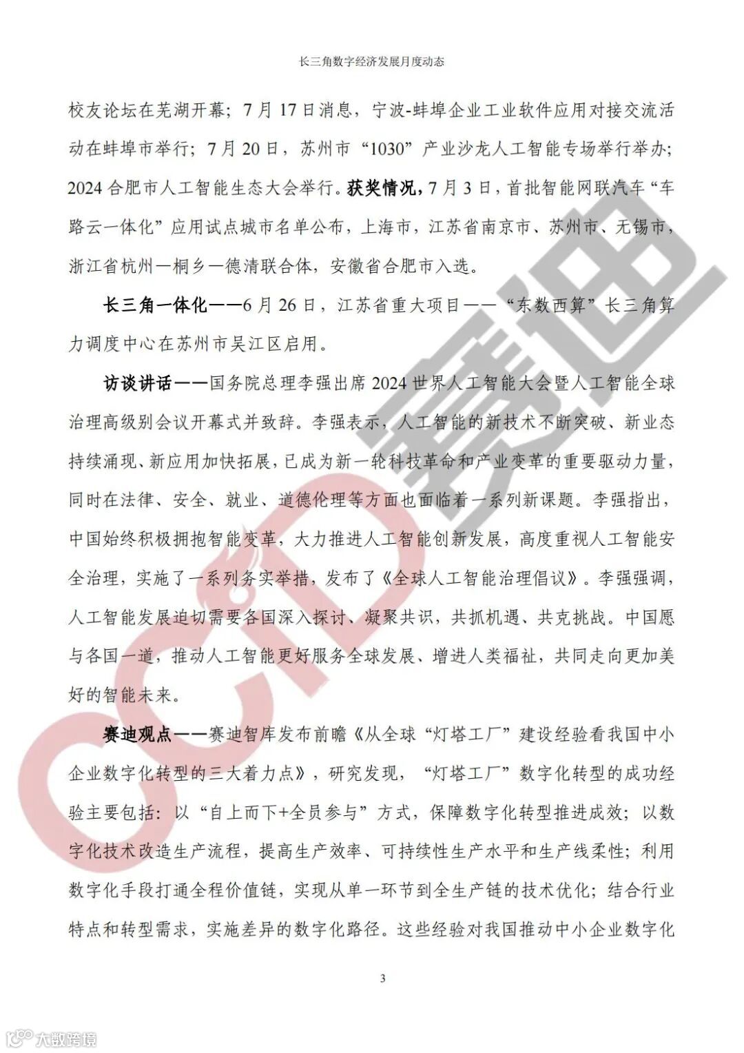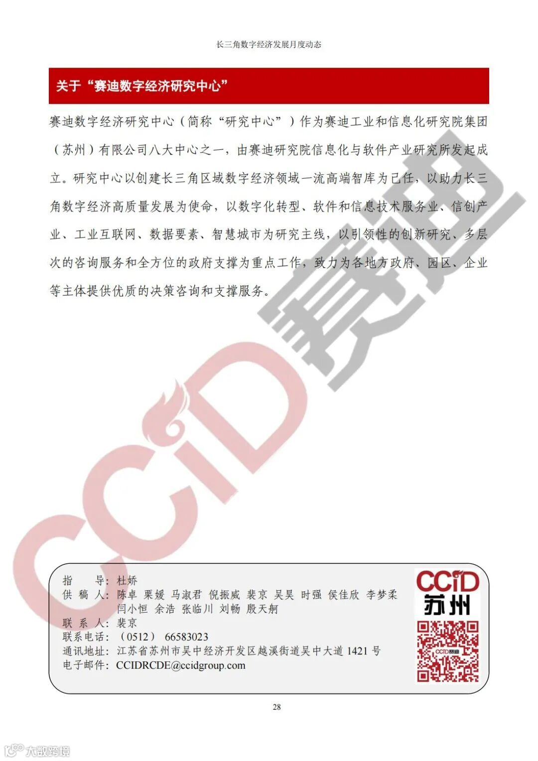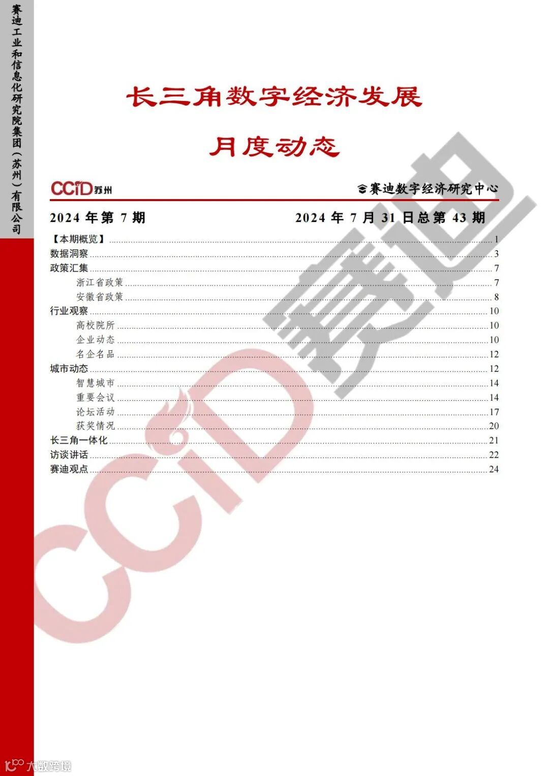 《长三角数字经济发展月度动态》2024年第7期来啦!本刊物由赛迪数字经济研究中心创办,重点聚焦《长江三角洲区域一体化发展规划纲要》中涵盖的27个中心区城市,以数字经济相关领域月度主要发展动态为主题,从数据洞察、政策汇集、行业观察、城市动态、长三角一体化、访谈讲话、赛迪观点等多个维度展现长三角数字经济的区域发展态势,进而为地方关切提供参考依据,助力地方经济社会发展。