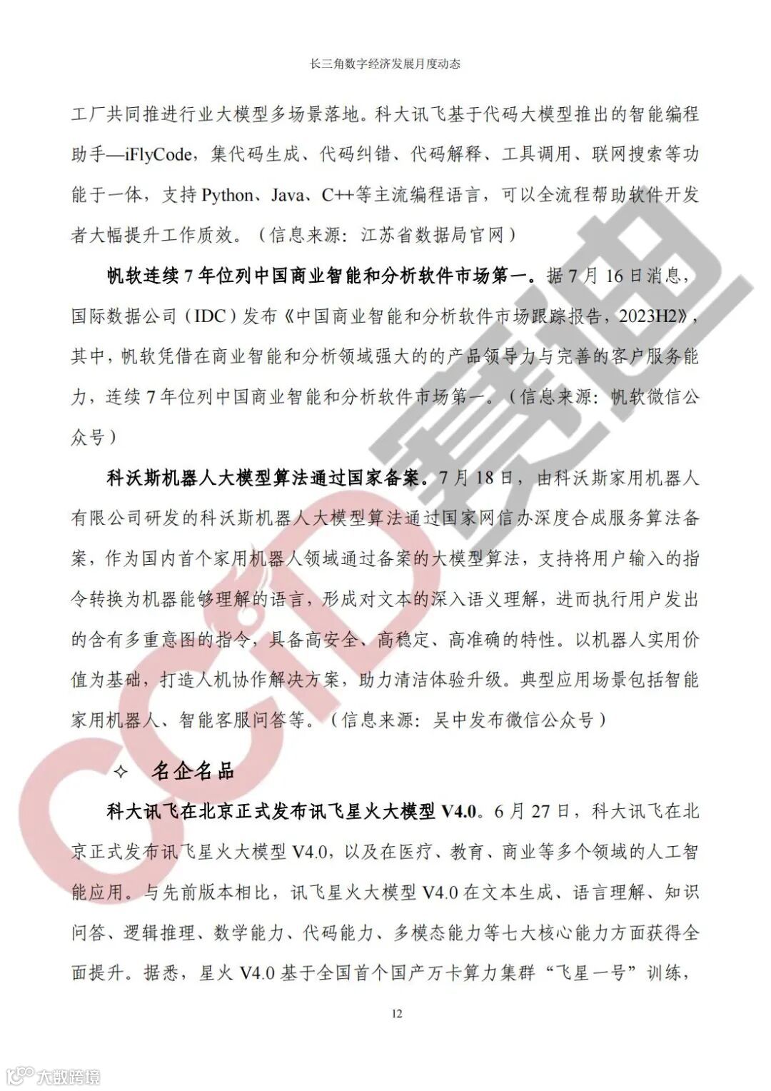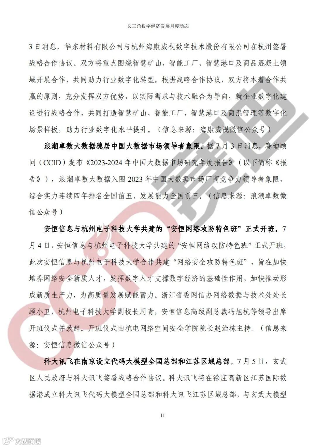 企业动态,华东材料与海康威视达成战略合作,共同助力基础材料场景数字化;浪潮卓数大数据稳居中国大数据市场领导者象限;安恒信息与杭州电子科技大学共建的“安恒网络攻防特色班”正式开班;科大讯飞在南京设立代码大模型全国总部和江苏区域总部;帆软连续7年位列中国商业智能和分析软件市场第一;科沃斯机器人大模型算法通过国家备案。
