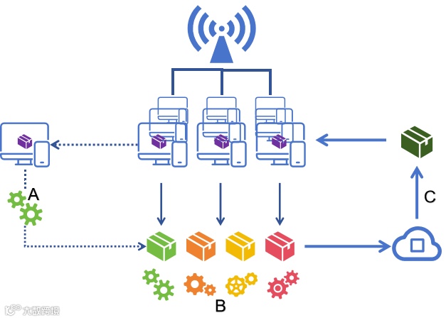 谷歌发布的TFF(TensorFlow Federated)开源框架代表的类似框架提出了一类解决方案——通过一种称为联邦学习(FL)的方法在去中心化数据上试验机器学习和其他计算,并已应用于医疗、交通、金融等多个领域。该方案下,同一行业内部署了压缩模型的每部终端设备不断获取数据并在本地完成对模型(A)的训练,这些被不同用户数据训练出来的新模型参数在总部服务器被汇总(B)聚合形成一个改进的共享模型(C)并下发至用户端完成更新,从而形成持续迭代的良性循环。这种模式无需用户上传训练用数据,虽然有着更高的防御要求,但可在保护用户数据安全及模型个性的同时,推动大模型持续升级迭代,最终实现用户与开发商互利合作的产业良性发展。