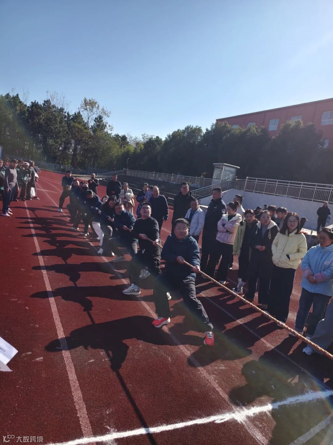 拔河比赛现场,参赛队员们脚蹬实地、腰杆挺直,紧握长绳凝聚成一股强劲合力,伴随着加油呐喊声奋力后拉,展现出 “拧成一股绳、劲往一处使” 的团队凝聚力。