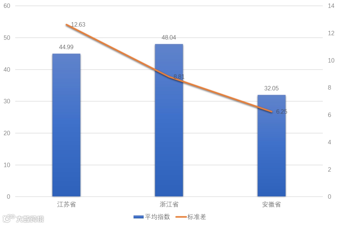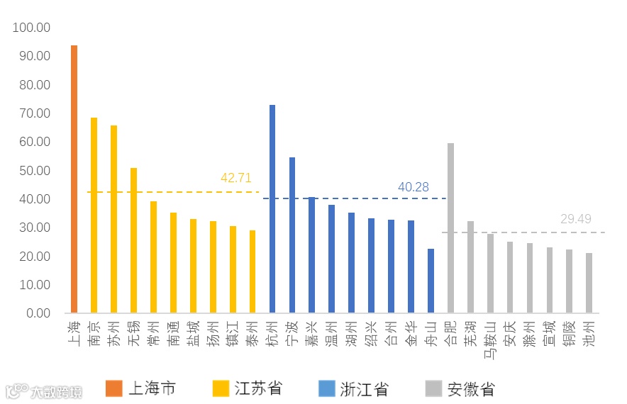 三省一市数字经济发展平均水平与上一年度保持一致,依旧是上海市各方面均表现优异,综合指标平均值呈现江苏省(42.71)高于浙江省(40.28)高于安徽省(29.49)。