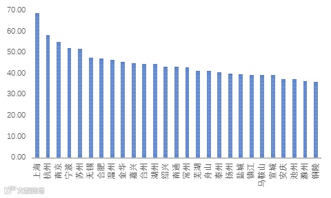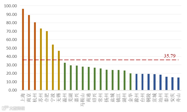 长三角27个城市数字经济发展环境指数平均值为35.79。上海、南京、杭州高居第一梯队,其中,上海数字经济发展环境指数位居长三角城市之首,高达96.51,为27个城市平均值的2.7倍;南京、杭州紧跟其后,发展环境指数依次为89.08、80.56。苏州、合肥、宁波、无锡等4个城市位列第二梯队,发展环境指数均高于平均值且介于40-80之间。温州、芜湖、嘉兴、马鞍山、南通、绍兴、常州、扬州、盐城、镇江、湖州、金华等12个城市数字经济发展环境指数在20-40之间,略低于平均值。滁州、台州、铜陵、宣城、池州、泰州、安庆、舟山等8个城市居于第四梯队,数字经济发展环境指数均低于20。