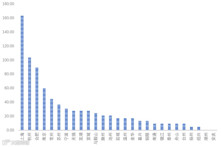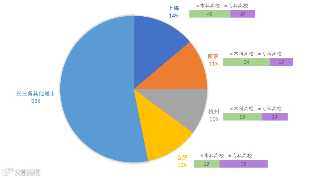 数字经济专业教育水平方面,上海、南京、杭州、合肥拥有长三角27个城市中较为丰富的教育资源。据教育部名单,上海共有64所高校(不含成人高校,下同),其中,本科院校40所,高职高专24所;南京共有51所高校,其中,本科院校34所,高职高专17所;杭州共有47所高校,其中本科院校28所,高职高专19所;合肥共有54所高校,其中,本科院校19所,高职高专35所。从数量上来看,上海、南京、杭州、合肥四大城市的高校数量接近长三角总量的一半。从高校教学水平来看,上海与南京拥有较多的本科院校,在数字经济相关专业的开设上处于长三角领先地位。