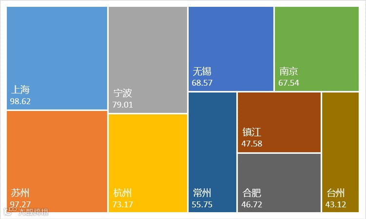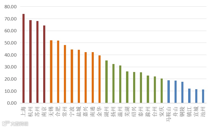 浙江省发展势头良好。综合指标高于全省平均值的城市从仅有杭州一城提升为杭州、宁波、嘉兴三城。杭州综合指数以73.01列省内第一,列长三角中心区城市第2,宁波综合指数54.61,排名与上年度一致,列长三角中心区城市第6,嘉兴综合指数40.59,排名从第10上升为第8。
