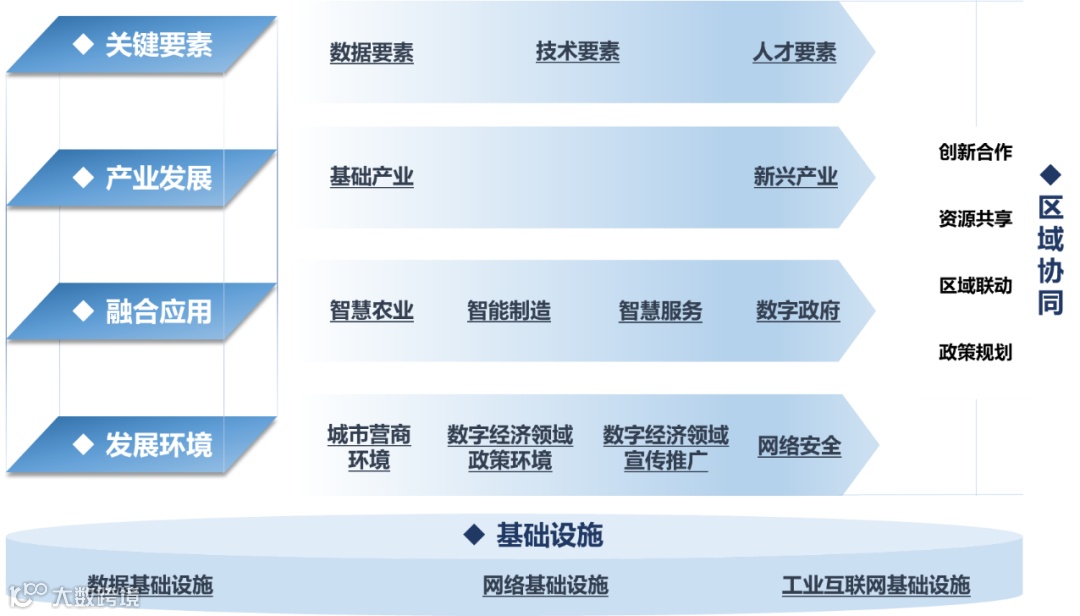 基础设施是数字经济发展的基石,数字基础设施通过发挥“数字”作为新型生产要素的巨大潜力,能有效对传统基础设施进行改造和赋能,通过打通经济社会发展的信息“大动脉”,其将进一步促进传统行业数字化转型升级,为经济社会数字化转型提供关键支撑和创新动能;关键要素是发展的核心引擎,生产力发展是人类社会发展的决定力量,每一次社会经济形态变革,都伴随新的生产要素出现,并带动社会生产力跃升,进入信息社会,数据成为新型生产要素,对生产、流通、分配、消费活动和经济运行机制、社会生活方式、国家治理模式等产生重要影响;核心产业是数字经济发展的主体,推动数字技术自身迭代创新的同时促进数字技术融合应用;融合应用是数字经济飞速发展的实体经济载体,通过数字技术融合应用,激发传统产业发展新活力;发展环境是数字经济健康发展的基础保障,良好的政策引导、规范的数字规则体系构建,将为数字经济长远可持续发展保驾护航。区域协同是地区数字经济发展的“倍增器”,通过区域间各个领域的合作,加快生产要素的流动效率,促进资源的合理分配及高效利用,在资源环境的容量限制下实现经济社会效益最大化。
