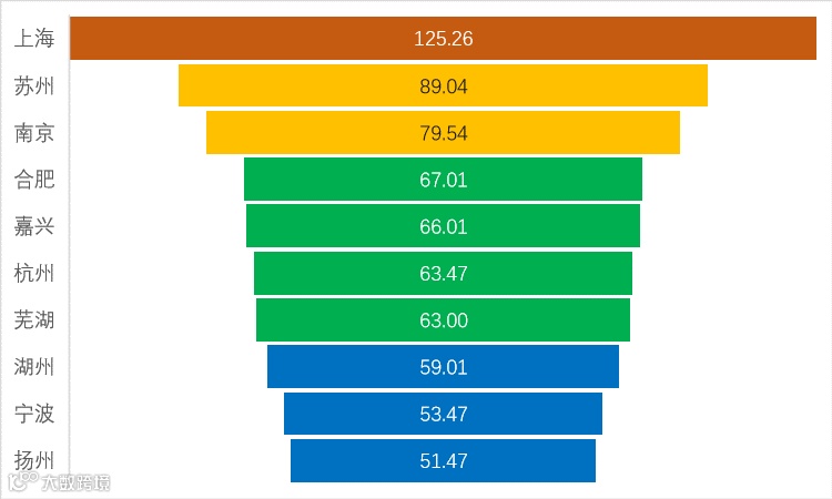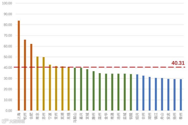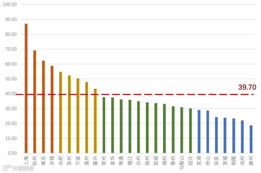 长三角各市数字经济发展指数平均值为39.87,其中8个城市指数在平均值之上。上海市以总指数93.97居长三角榜首,杭州、南京位列第二、三名,指数分别为73.01、68.42,苏州紧随其后,指数为65.69,前四名与2021年保持一致。