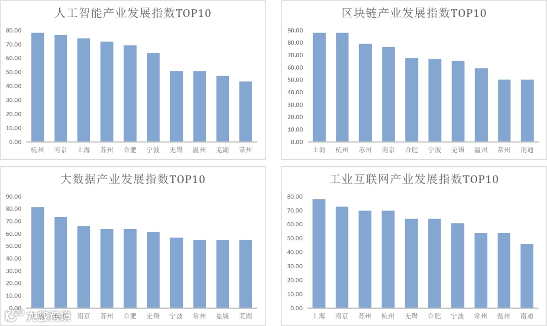 从细分指标看,人工智能产业方面,杭州以78.10的人工智能产业发展指数位列长三角第一,南京、上海、苏州紧随其后,发展指数均超过70。作为浙江省人工智能产业发展的核心区域,杭州集聚了超过全省三分之一的人工智能核心企业。2021年,杭州人工智能产业营业收入达2038.5亿元,研发费用225.8亿元,产业增加值增长26.9%。区块链产业方面,上海、杭州齐头并进,均位列长三角区块链产业发展指数第一,苏州、南京次之,发展指数均超过70。杭州是全国区块链技术与产业发展最成熟的城市之一,目前拥有100多家区块链企业,7个区块链产业园,8家企业上榜全球区块链发明专利前100强。大数据产业方面,沪杭表现突出,上海以81.32的大数据产业发展指数,位列长三角27个城市之首,苏州获得第二名。近年来,苏州大力推进大数据产业试点示范创建,累计获评工信部大数据试点示范项目8个,省级大数据试点示范项目37个,入选江苏省“数动未来”融合创新中心16家、DCMM贯标评估单位32家、首席数据官制度试点企业6家、数据要素市场生态培育项目8个。工业互联网产业方面,上海持续领跑,宁苏杭紧追其后。截至目前,南京共有5地入选工业互联网推动数字化创新领先园区,入选总数位居全国第一方阵;在“2021中国产业互联网百强榜”名单中,南京企业占13席,总数仅次于上海,位居全国第二。