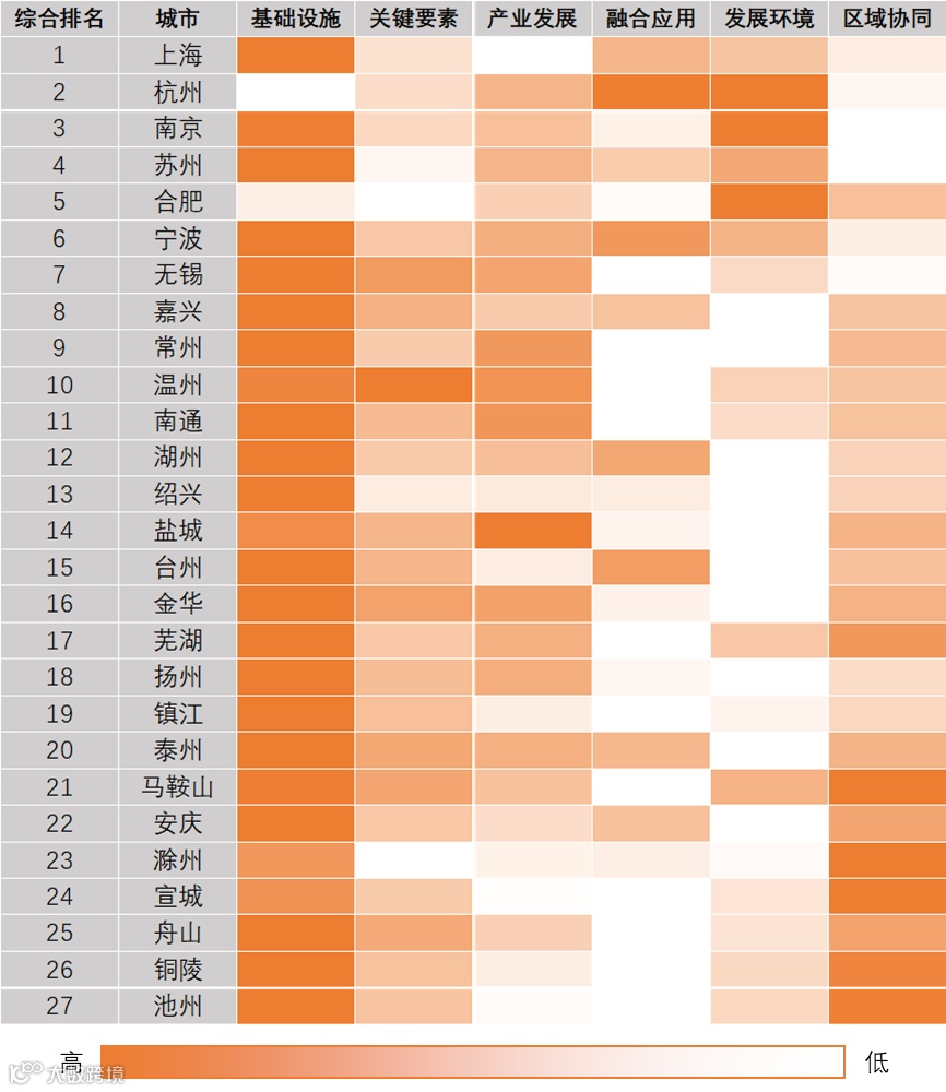 长三角27个中心城市一级指标色阶图颜色变化基于各城市六项一级指标数据制作,其中颜色越深代表数据越大,展示了各地的优势和劣势所在。如,对于上海自身而言,其优势是基础设施,而在产业发展方面仍需提升;对于杭州而言,其发展环境和融合应用水平较好,但数字经济发展基础设施仍需提升。各省(区、市)应依据地区特征继续推动得分较高的指标保持优势,同时注意补齐短板,实现数字经济全面、平衡发展。