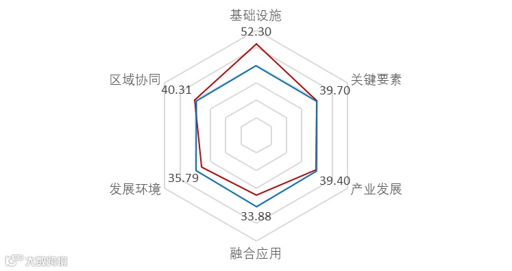以27个中心城市为整体,从六个一级指标的结果来看,基础设施与区域协同得分高于平均值(39.87),关键要素、产业发展接近平均值,而融合应用与发展环境稍显逊色。