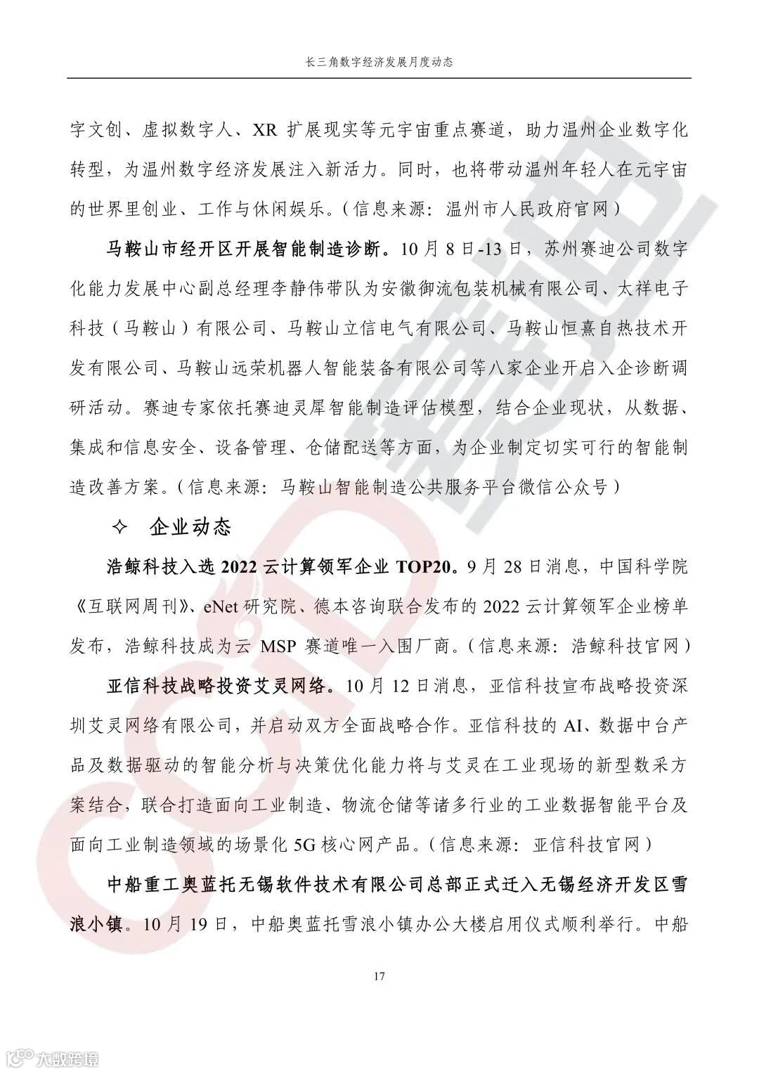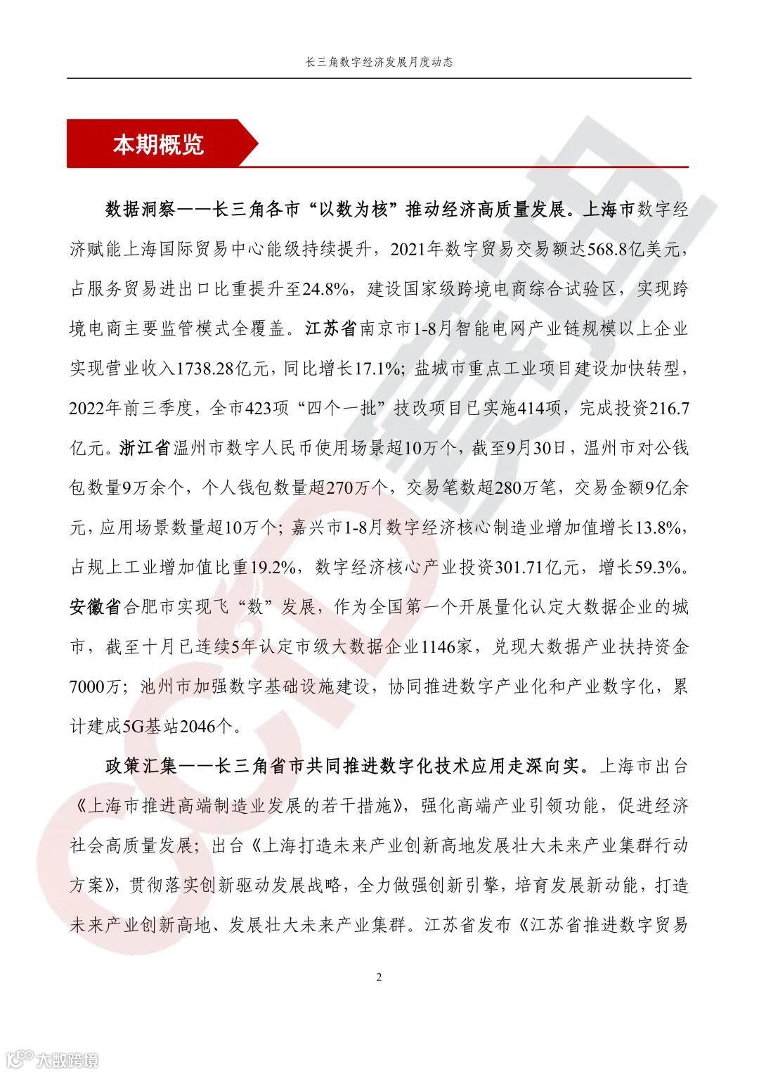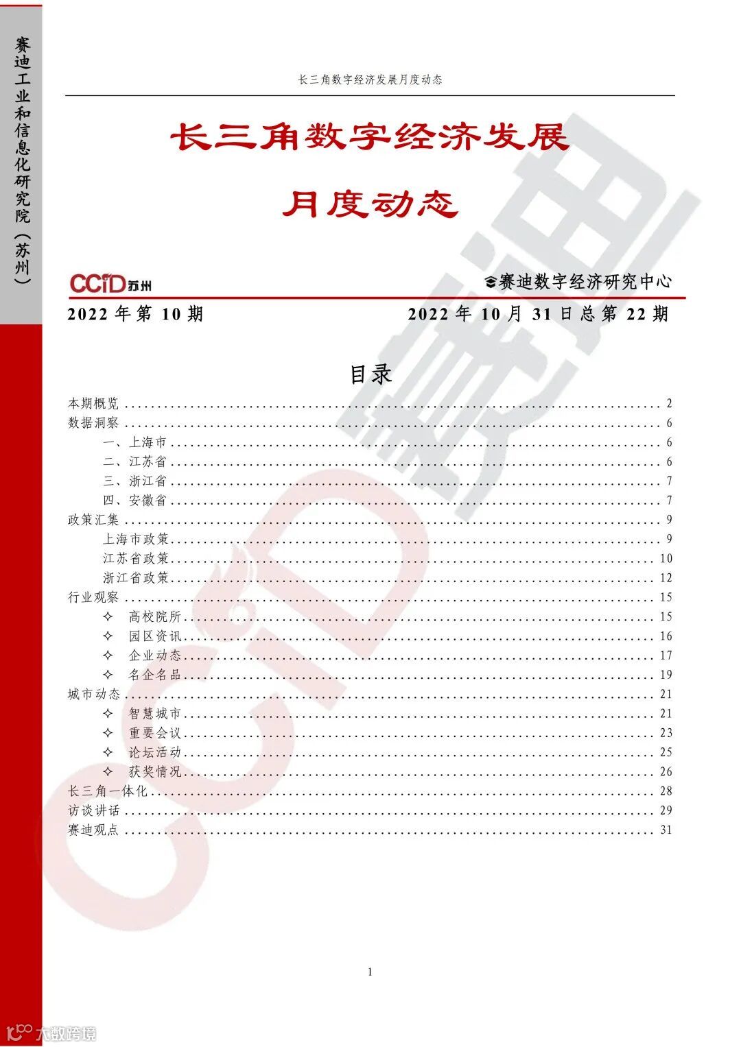 《长三角数字经济发展月度动态》2022年第10期来啦!本刊物由赛迪数字经济研究中心创办,重点聚焦《长江三角洲区域一体化发展规划纲要》中涵盖的27个中心区城市,以数字经济相关领域月度主要发展动态为主题,从数据洞察、政策汇集、行业观察、城市动态、长三角一体化、访谈讲话、赛迪观点等多个维度展现长三角数字经济的区域发展态势,进而为地方关切提供参考依据,助力地方经济社会发展。