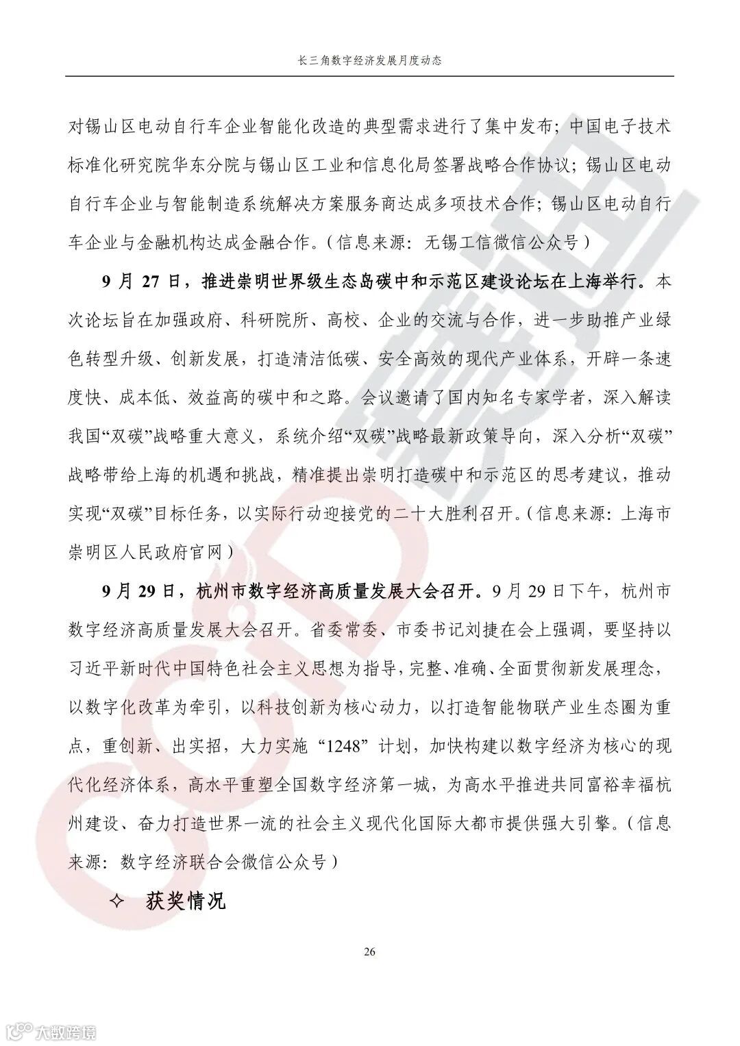 论坛活动,9月26日,由江苏省工业和信息化厅主办的江苏省智能制造进园区(电动自行车行业)专题活动在无锡市成功举办;9月27日,推进崇明世界级生态岛碳中和示范区建设论坛在上海举行;9月29日,杭州市数字经济高质量发展大会召开。