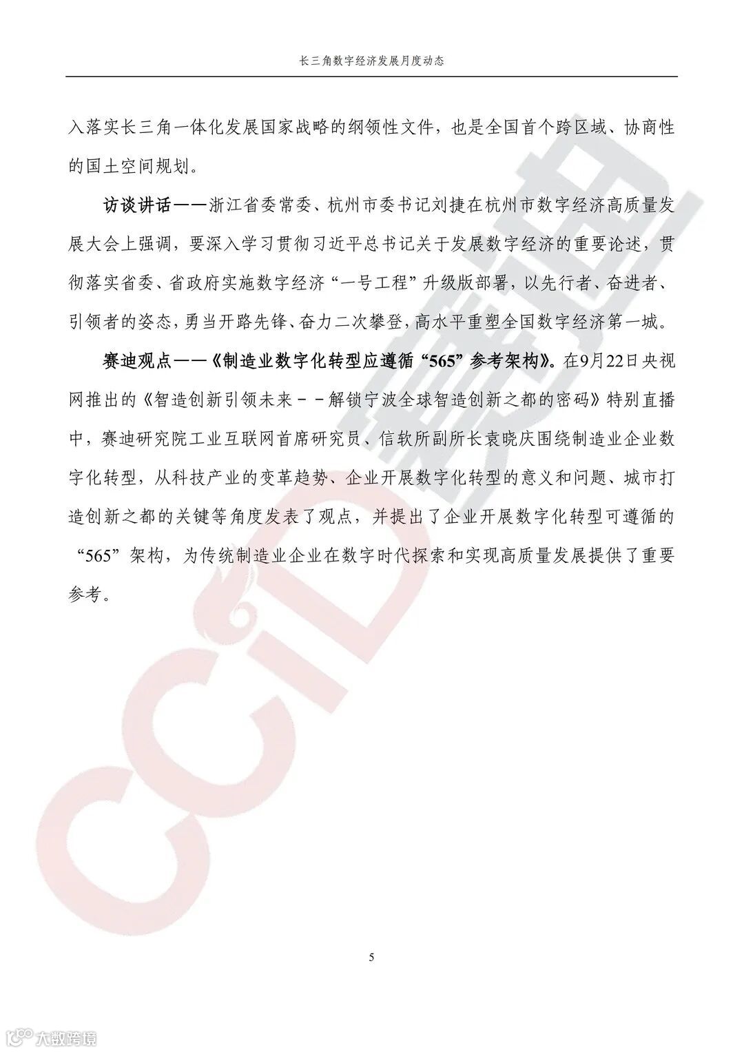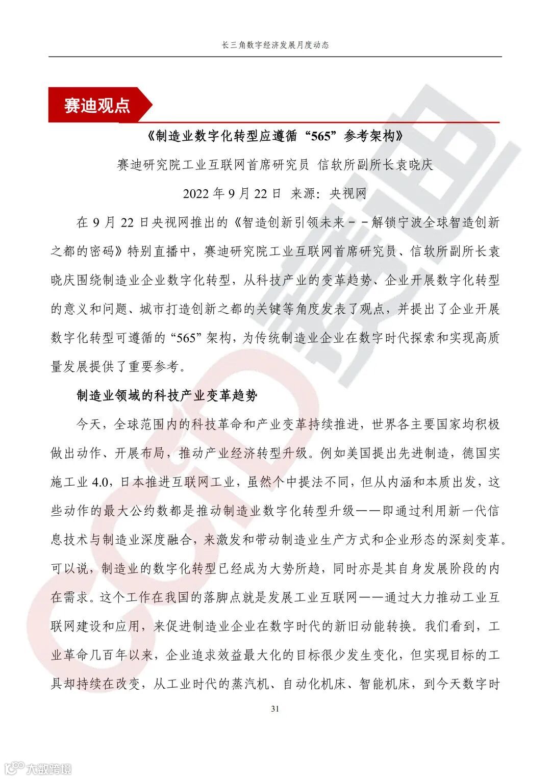 《制造业数字化转型应遵循“565”参考架构》。在9月22日央视网推出的《智造创新引领未来--解锁宁波全球智造创新之都的密码》特别直播中,赛迪研究院工业互联网首席研究员、信软所副所长袁晓庆围绕制造业企业数字化转型,从科技产业的变革趋势、企业开展数字化转型的意义和问题、城市打造创新之都的关键等角度发表了观点,并提出了企业开展数字化转型可遵循的“565”架构,为传统制造业企业在数字时代探索和实现高质量发展提供了重要参考。