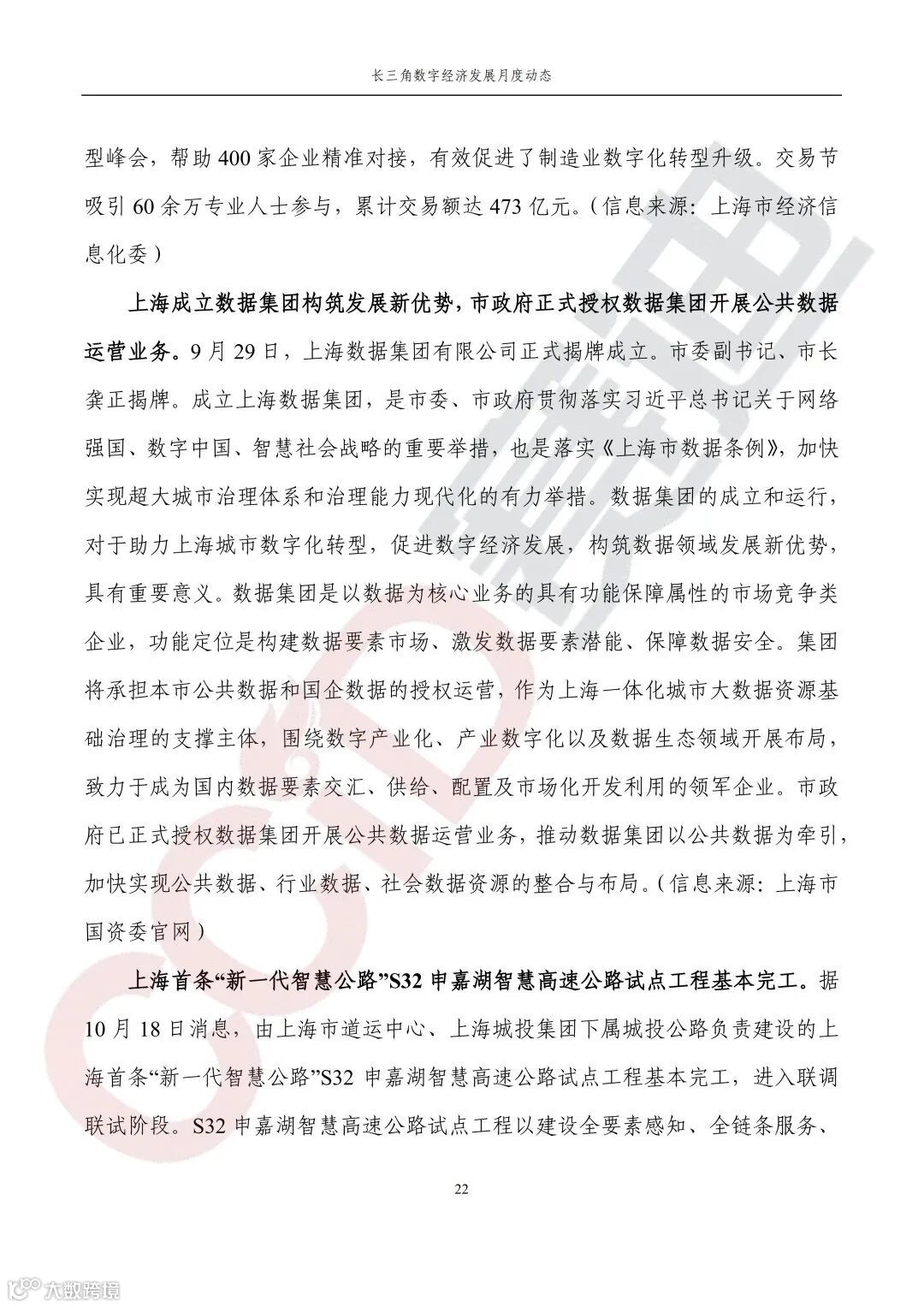 智慧城市,中国广电5G(上海)网络服务启航;第三届中国(上海)工业品在线交易节闭幕;上海成立数据集团,市政府正式授权数据集团开展公共数据运营业务;上海首条“新一代智慧公路”S32申嘉湖智慧高速公路试点工程基本完工;宁波市上线企业闭环生产数字化应用。