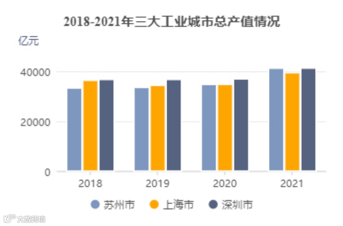 ‖ 图 1 :2018-2021 年三大工业城同时总产值情况(来源:赛迪数字经济研究中心)