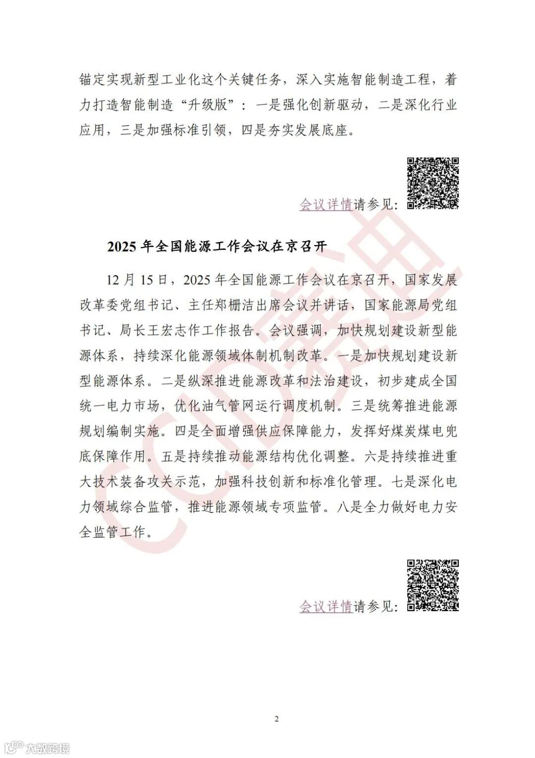 12月15日,2025年全国能源工作会议在京召开,国家发展改革委党组书记、主任郑栅洁出席会议并讲话。会议强调,加快规划建设新型能源体系,持续深化能源领域体制机制改革。一是加快规划建设新型能源体系。二是纵深推进能源改革和法治建设。三是统筹推进能源规划编制实施。四是全面增强供应保障能力。五是持续推动能源结构优化调整。六是持续推进重大技术装备攻关示范。七是深化电力领域综合监管。八是全力做好电力安全监管工作。