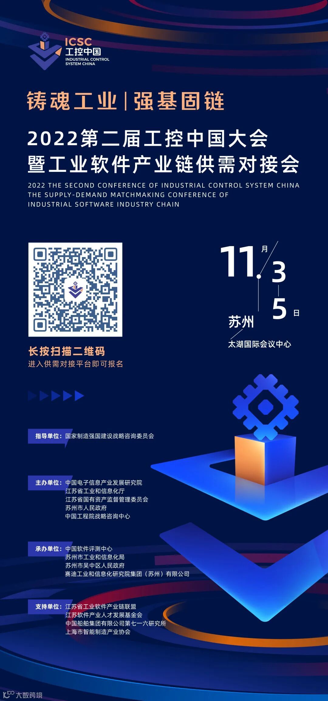 2022第二届工控中国大会将于11月3日-5日在苏州太湖国际会议中心举办,同期将举办“工控和工业软件产品、解决方案和创新应用案例展示”活动。大会由国家制造强国建设战略咨询委员会指导,中国电子信息产业发展研究院、江苏省工业和信息化厅、江苏省政府国有资产监督管理委员会、苏州市人民政府、中国工程院战略咨询中心共同主办。