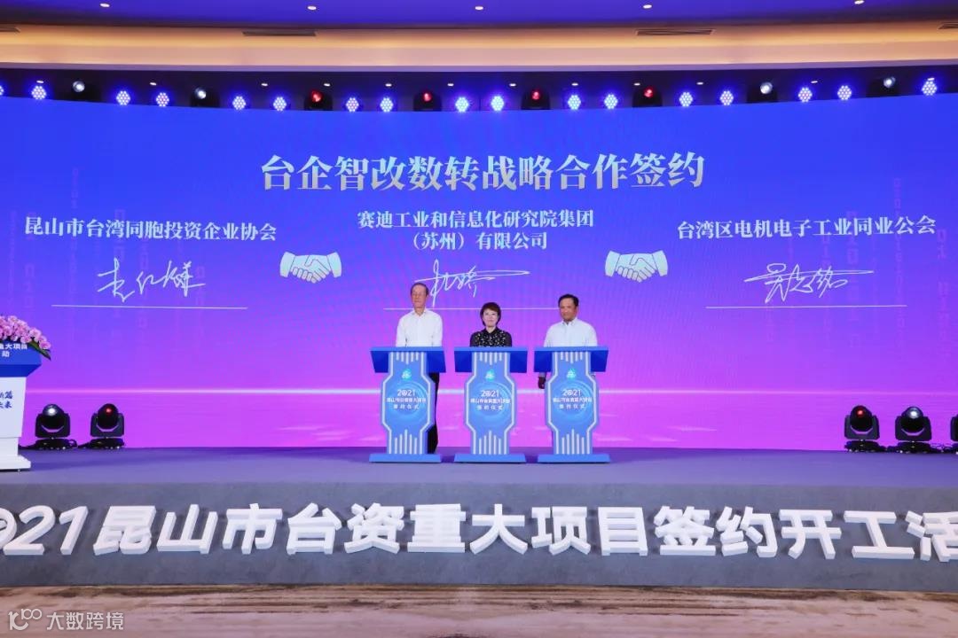 青山一道同云雨,明月何曾是两乡。9月16日,“最强县级市”——昆山举办了台资重大项目签约开工活动,共有36个台资重大项目签约开工,总投资516亿元。开工仪式上,作为重大平台载体,总经理杜娇女士代表赛迪苏州公司,与昆山市台湾同胞投资企业协会、台湾区电机电子工业同业公会进行台企智改数转战略合作签约。