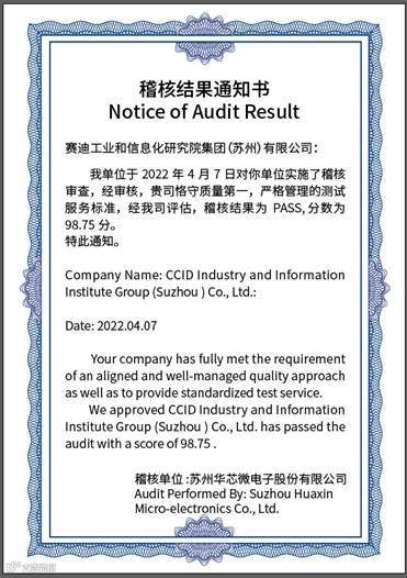 简讯:苏州赛迪中国芯应用创新中心事业部高分98.75分通过苏州华芯微电子股份有限公司的稽核