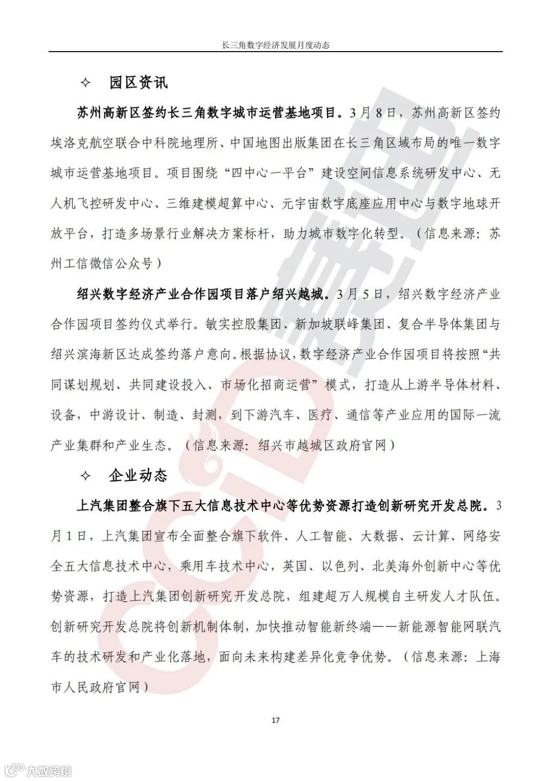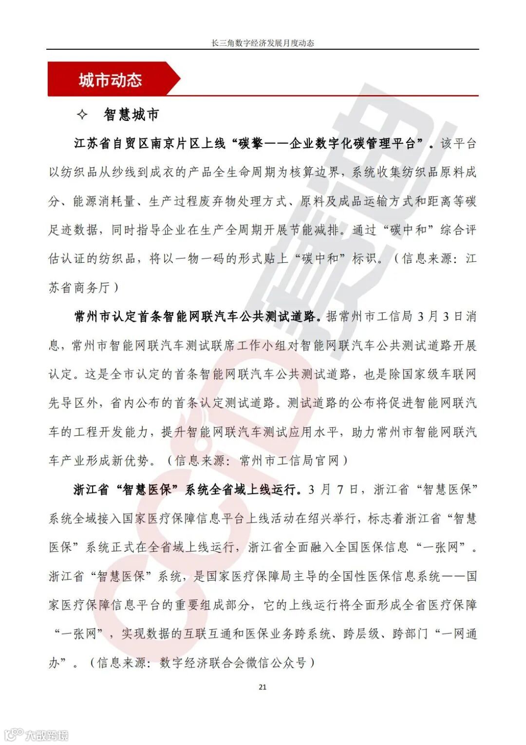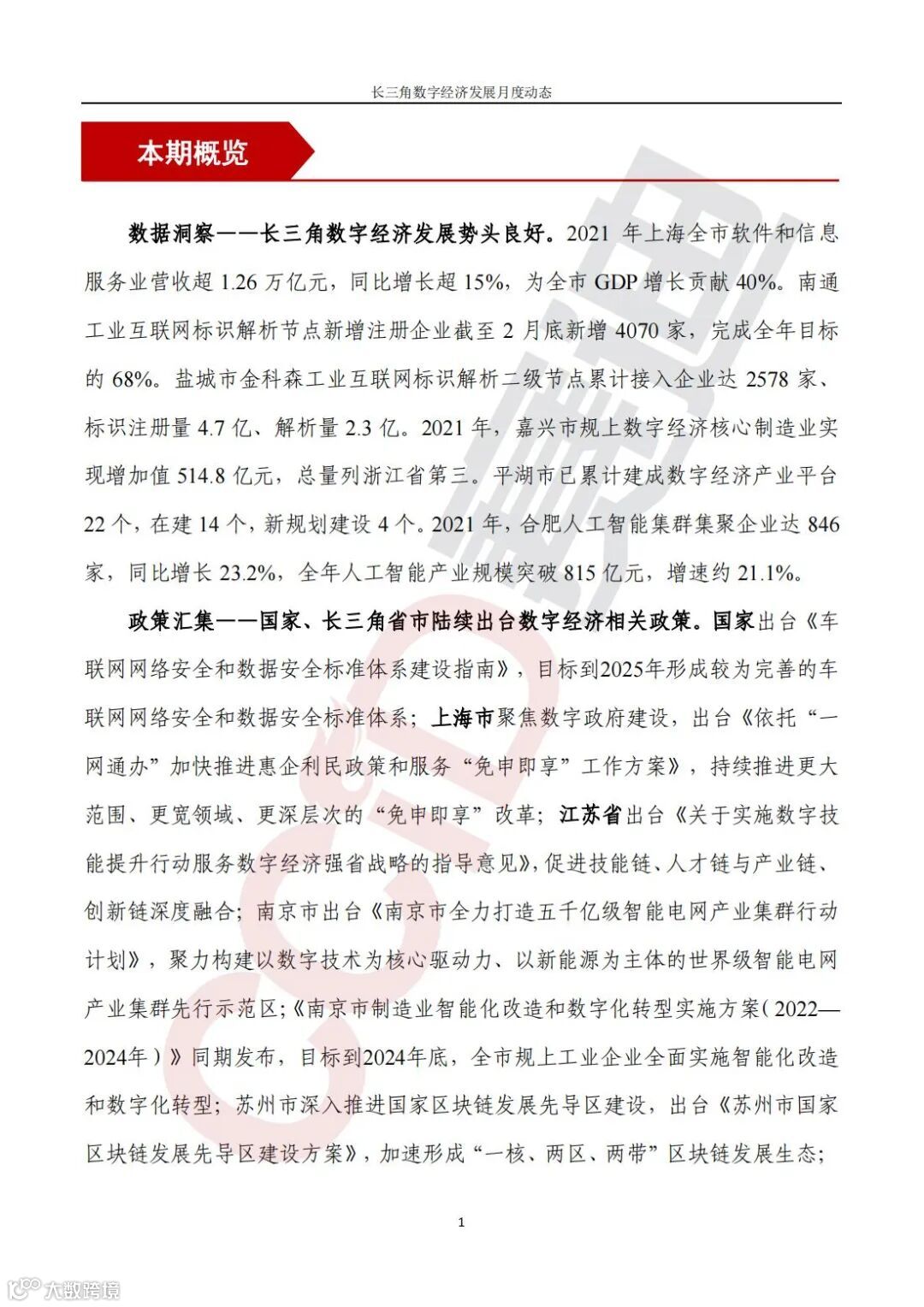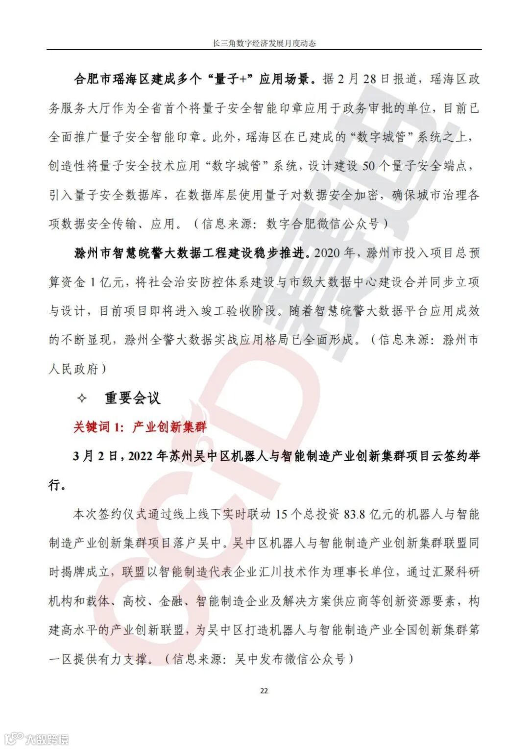 《长三角数字经济发展月度动态》2022年第3期来啦!本刊物由赛迪数字经济研究中心创办,重点聚焦《长江三角洲区域一体化发展规划纲要》中涵盖的27个中心区城市,以数字经济相关领域月度主要发展动态为主题,从数据洞察、政策汇集、行业观察、城市动态、长三角一体化、访谈讲话、赛迪观点等多个维度展现长三角数字经济的区域发展态势,进而为地方关切提供参考依据,助力地方经济社会发展。