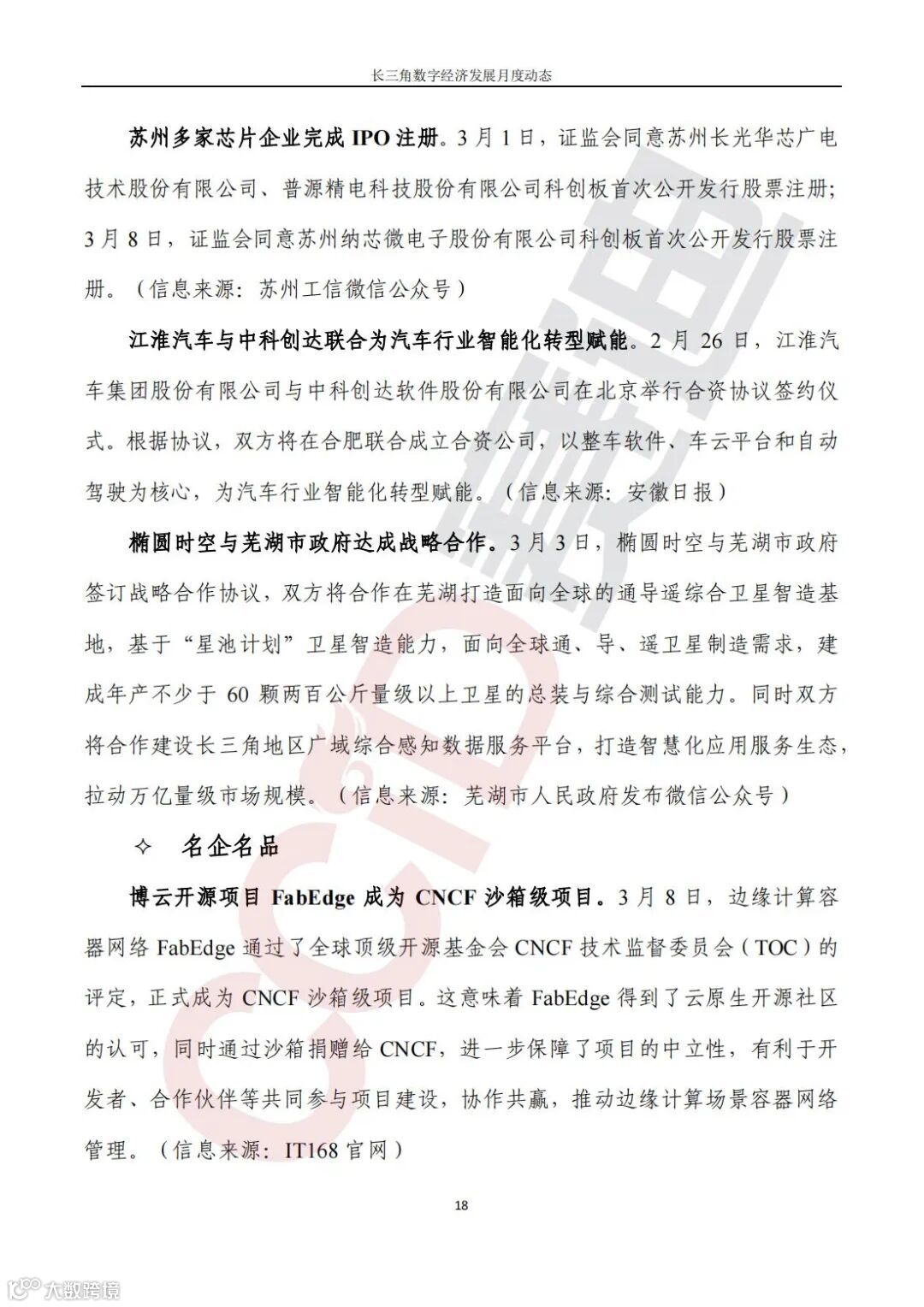 企业动态,上汽集团创新研究开发总院全面整合旗下五大信息技术中心,苏州多家芯片企业完成IPO注册,江淮汽车与中科创达联合为汽车行业智能化转型赋能,椭圆时空与芜湖市合作打造面向全球的通导遥综合卫星智造基地与长三角地区广域综合感知数据服务平台。