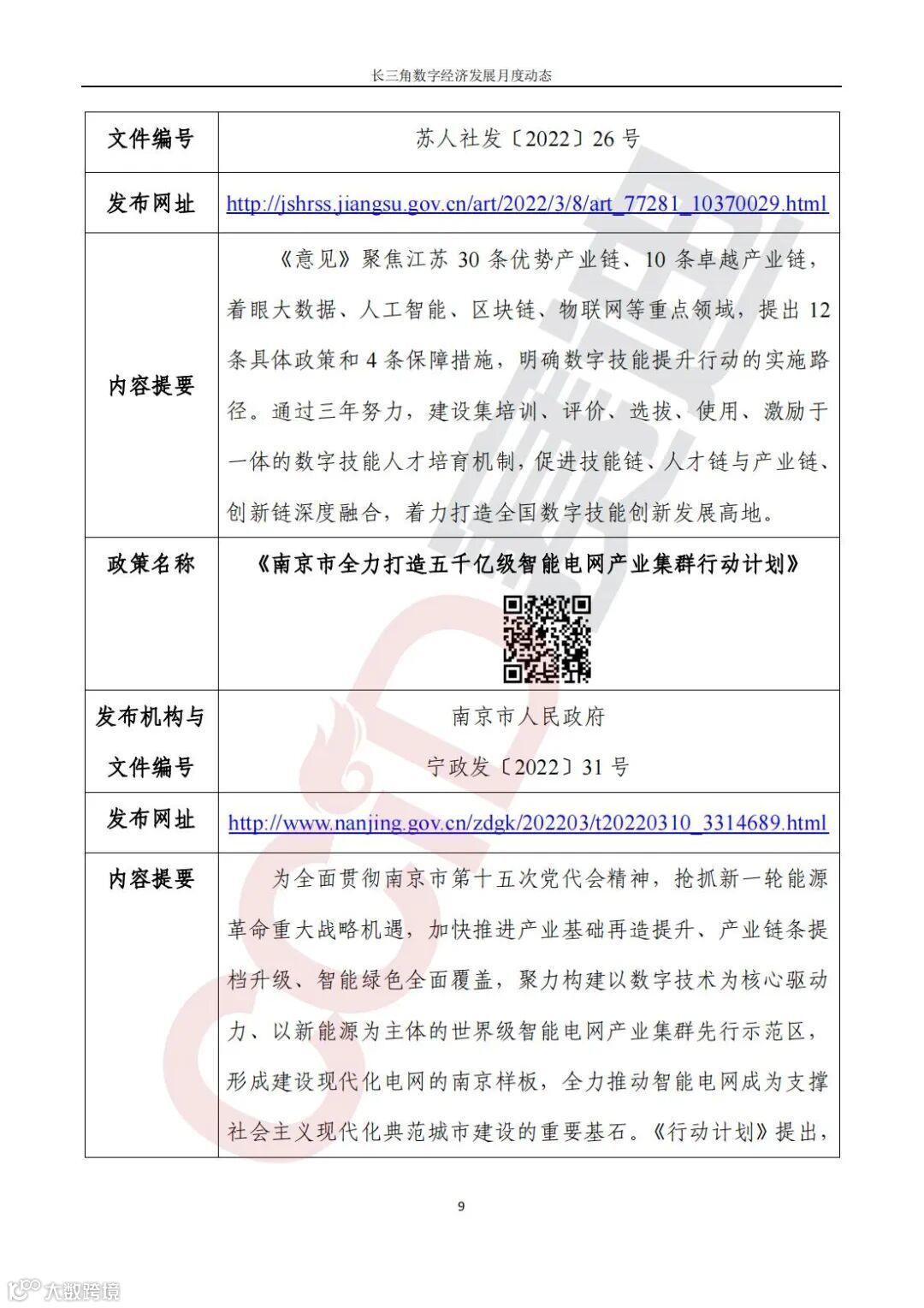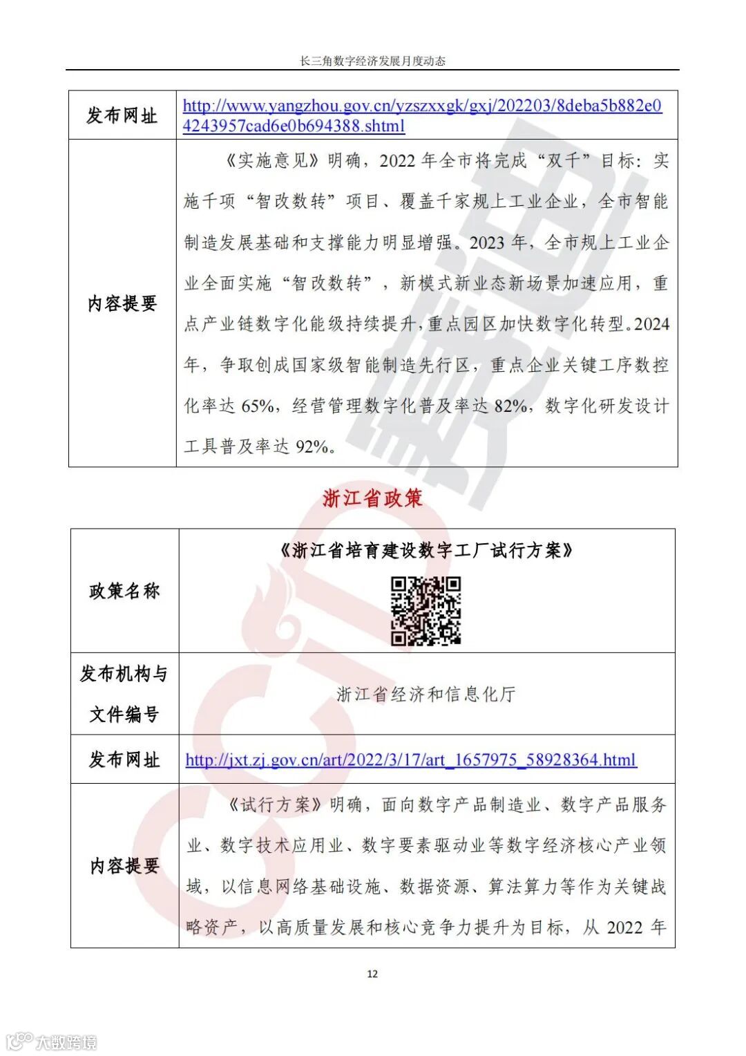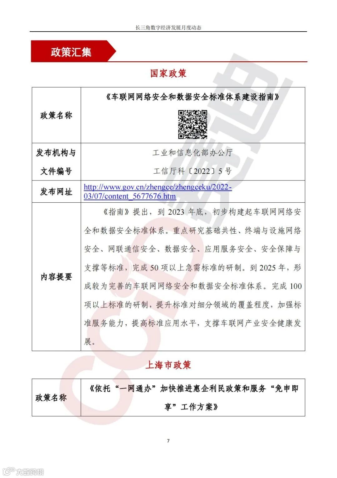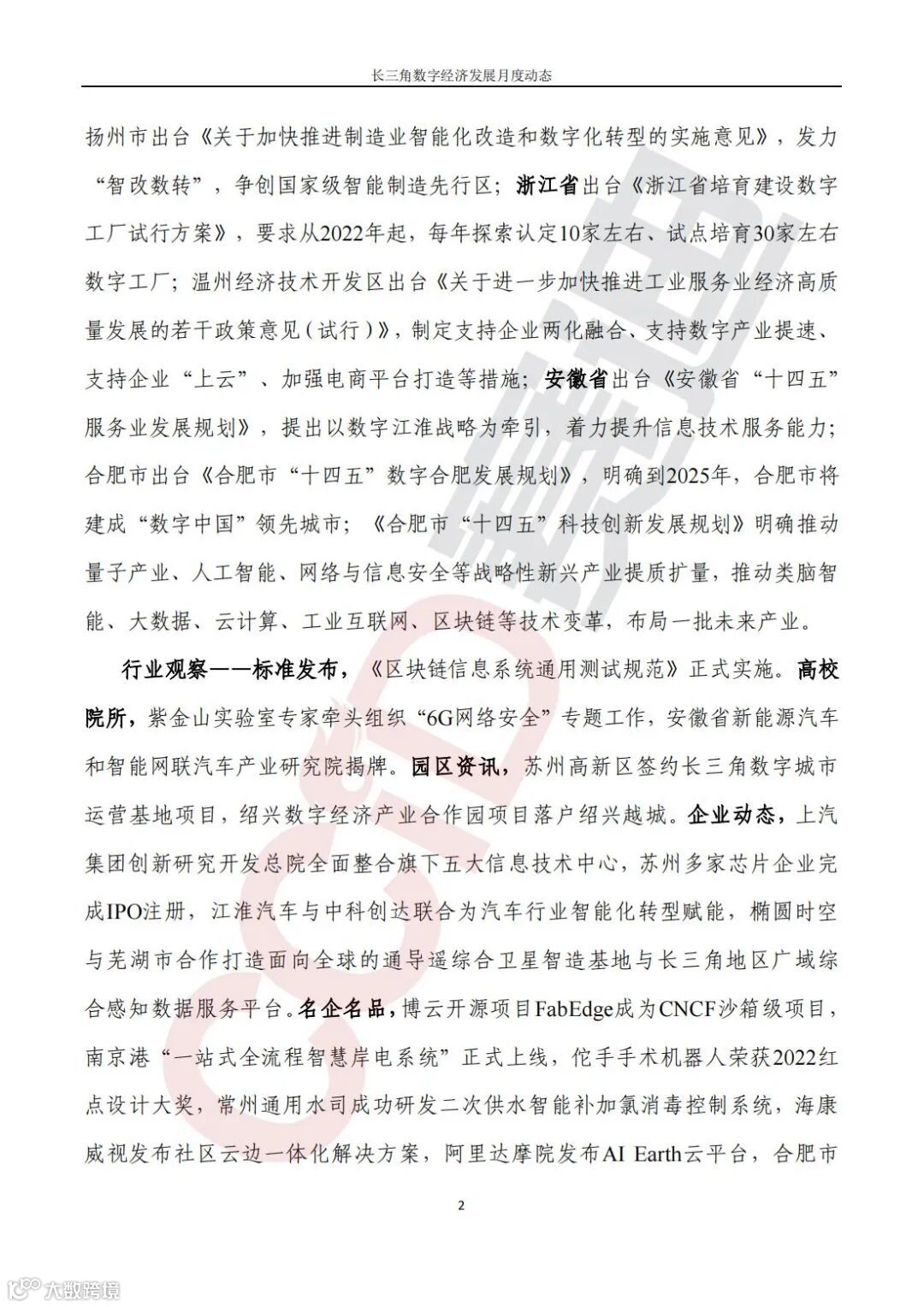 国家、长三角省市陆续出台数字经济相关政策。国家出台《车联网网络安全和数据安全标准体系建设指南》,目标到2025年形成较为完善的车联网网络安全和数据安全标准体系;上海市聚焦数字政府建设,出台《依托“一网通办”加快推进惠企利民政策和服务“免申即享”工作方案》,持续推进更大范围、更宽领域、更深层次的“免申即享”改革;江苏省出台《关于实施数字技能提升行动服务数字经济强省战略的指导意见》,促进技能链、人才链与产业链、创新链深度融合;南京市出台《南京市全力打造五千亿级智能电网产业集群行动计划》,聚力构建以数字技术为核心驱动力、以新能源为主体的世界级智能电网产业集群先行示范区;《南京市制造业智能化改造和数字化转型实施方案(2022—2024年)》同期发布,目标到2024年底,全市规上工业企业全面实施智能化改造和数字化转型;苏州市深入推进国家区块链发展先导区建设,出台《苏州市国家区块链发展先导区建设方案》,加速形成“一核、两区、两带”区块链发展生态;扬州市出台《关于加快推进制造业智能化改造和数字化转型的实施意见》,发力“智改数转”,争创国家级智能制造先行区;浙江省出台《浙江省培育建设数字工厂试行方案》,要求从2022年起,每年探索认定10家左右、试点培育30家左右数字工厂;温州经济技术开发区出台《关于进一步加快推进工业服务业经济高质量发展的若干政策意见(试行)》,制定支持企业两化融合、支持数字产业提速、支持企业“上云”、加强电商平台打造等措施;安徽省出台《安徽省“十四五”服务业发展规划》,提出以数字江淮战略为牵引,着力提升信息技术服务能力;合肥市出台《合肥市“十四五”数字合肥发展规划》,明确到2025年,合肥市将建成“数字中国”领先城市;《合肥市“十四五”科技创新发展规划》明确推动量子产业、人工智能、网络与信息安全等战略性新兴产业提质扩量,推动类脑智能、大数据、云计算、工业互联网、区块链等技术变革,布局一批未来产业。