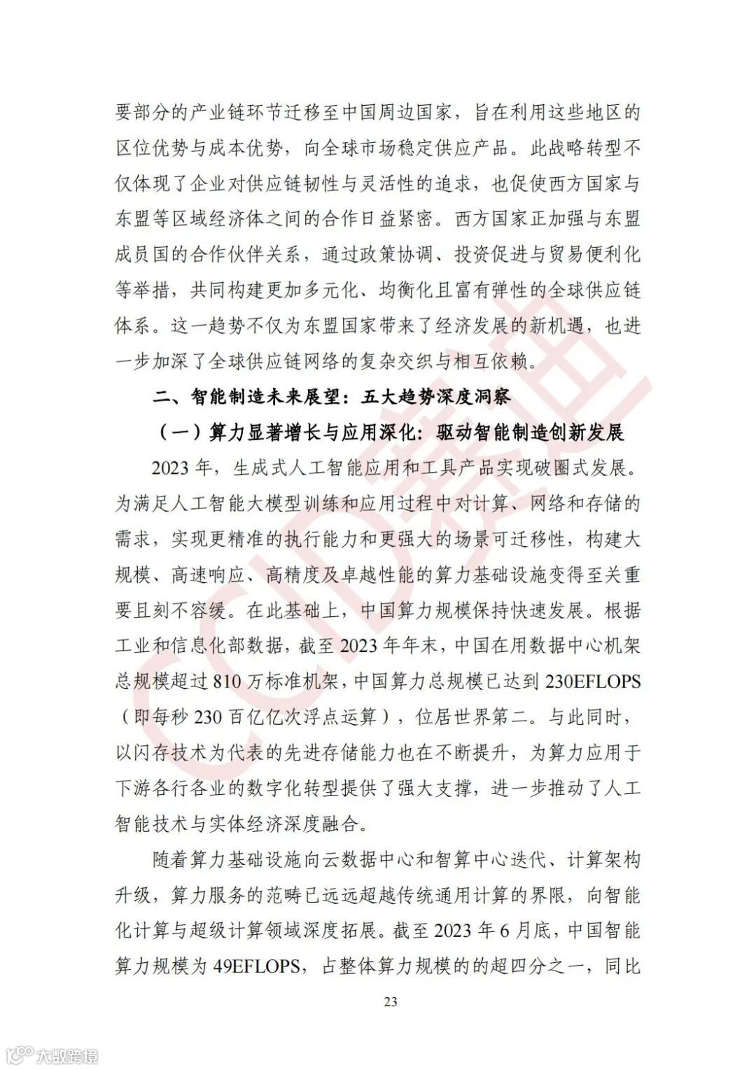 算力显著增长与应用深化:驱动智能制造创新发展。截至2023年年末,中国在用数据中心机架总规模超过810万标准机架,中国算力总规模已达到230EFLOPS,位居世界第二。截至2023年6月底,中国智能算力规模为49EFLOPS,占整体算力规模的的超四分之一,同比增速高达45%,较算力规模的整体增速高15个百分点。