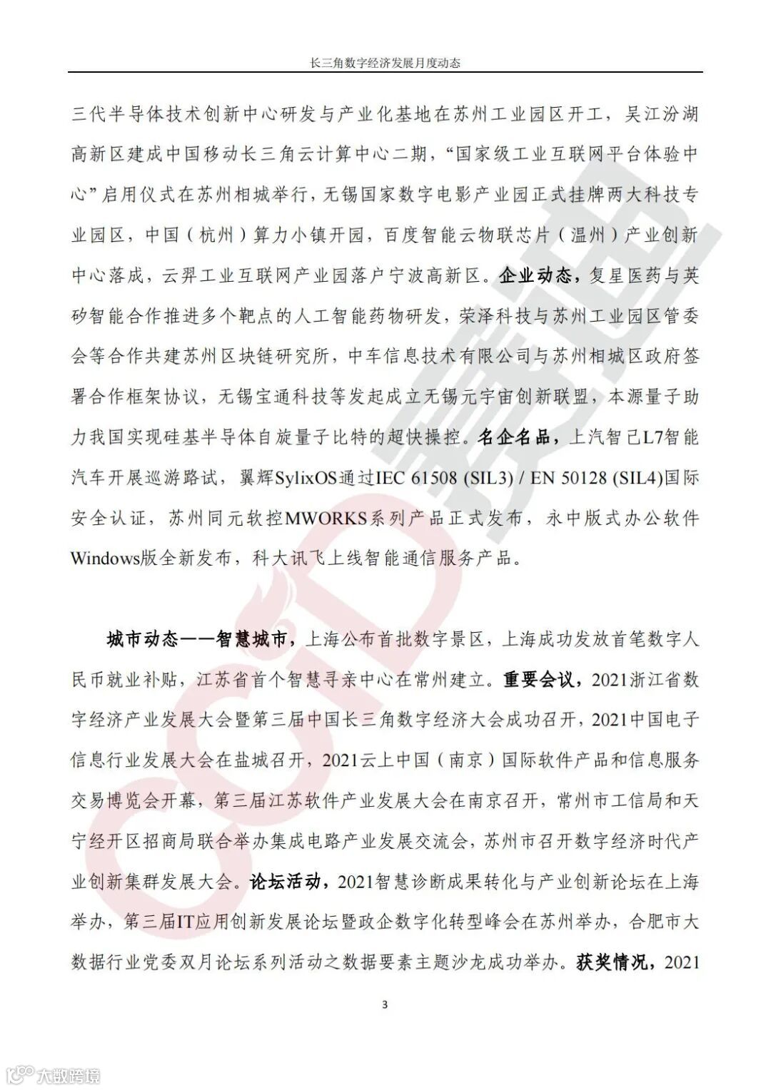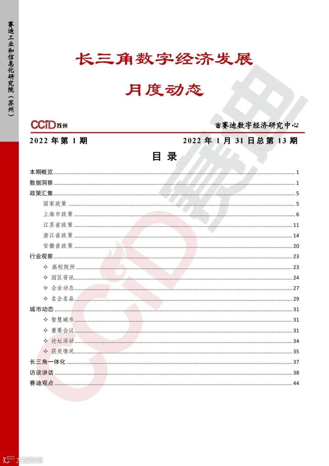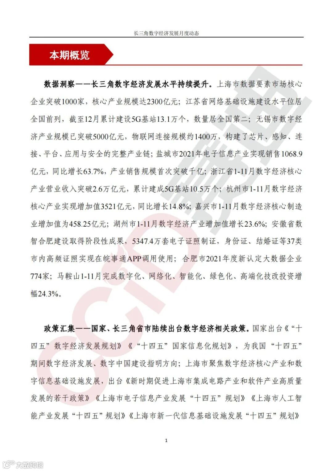 《长三角数字经济发展月度动态》2022年第1期来啦!本刊物由赛迪数字经济研究中心创办,重点聚焦《长江三角洲区域一体化发展规划纲要》中涵盖的27个中心区城市,以数字经济相关领域月度主要发展动态为主题,从数据洞察、政策汇集、行业观察、城市动态、长三角一体化、访谈讲话、赛迪观点等多个维度展现长三角数字经济的区域发展态势,进而为地方关切提供参考依据,助力地方经济社会发展。
