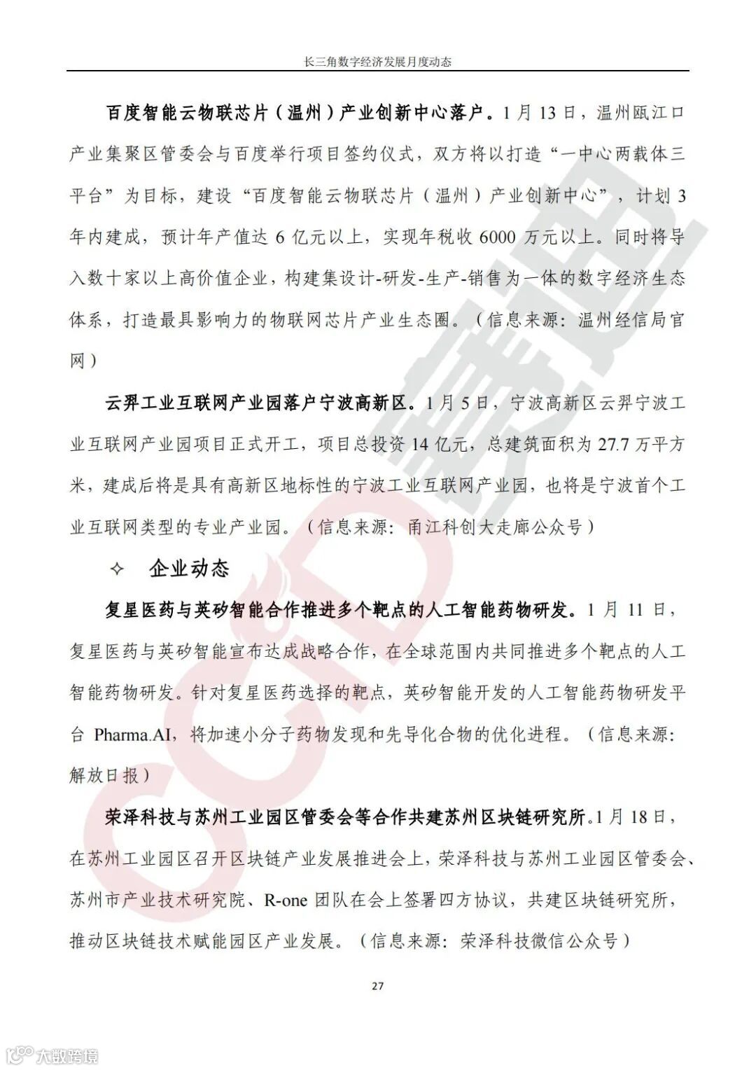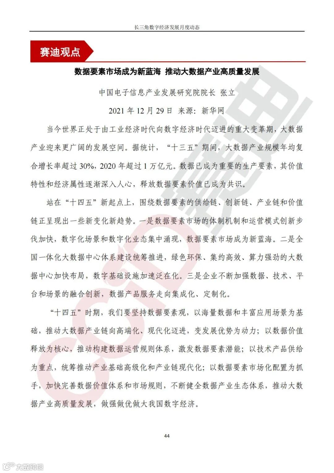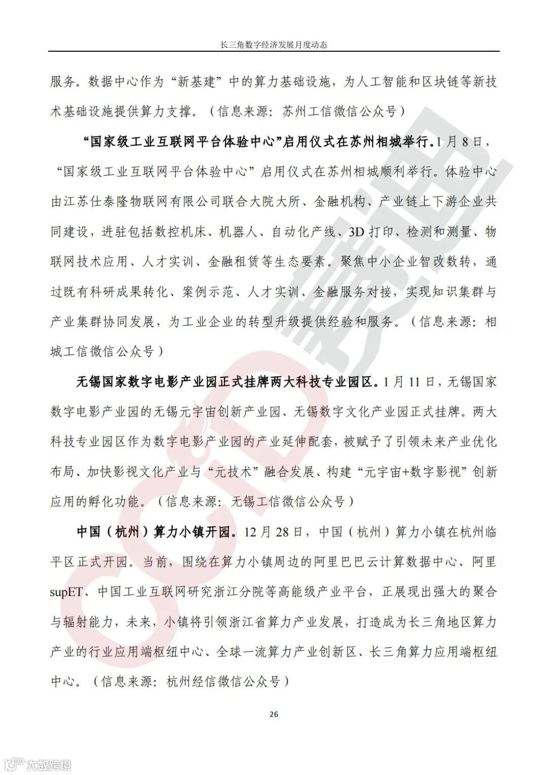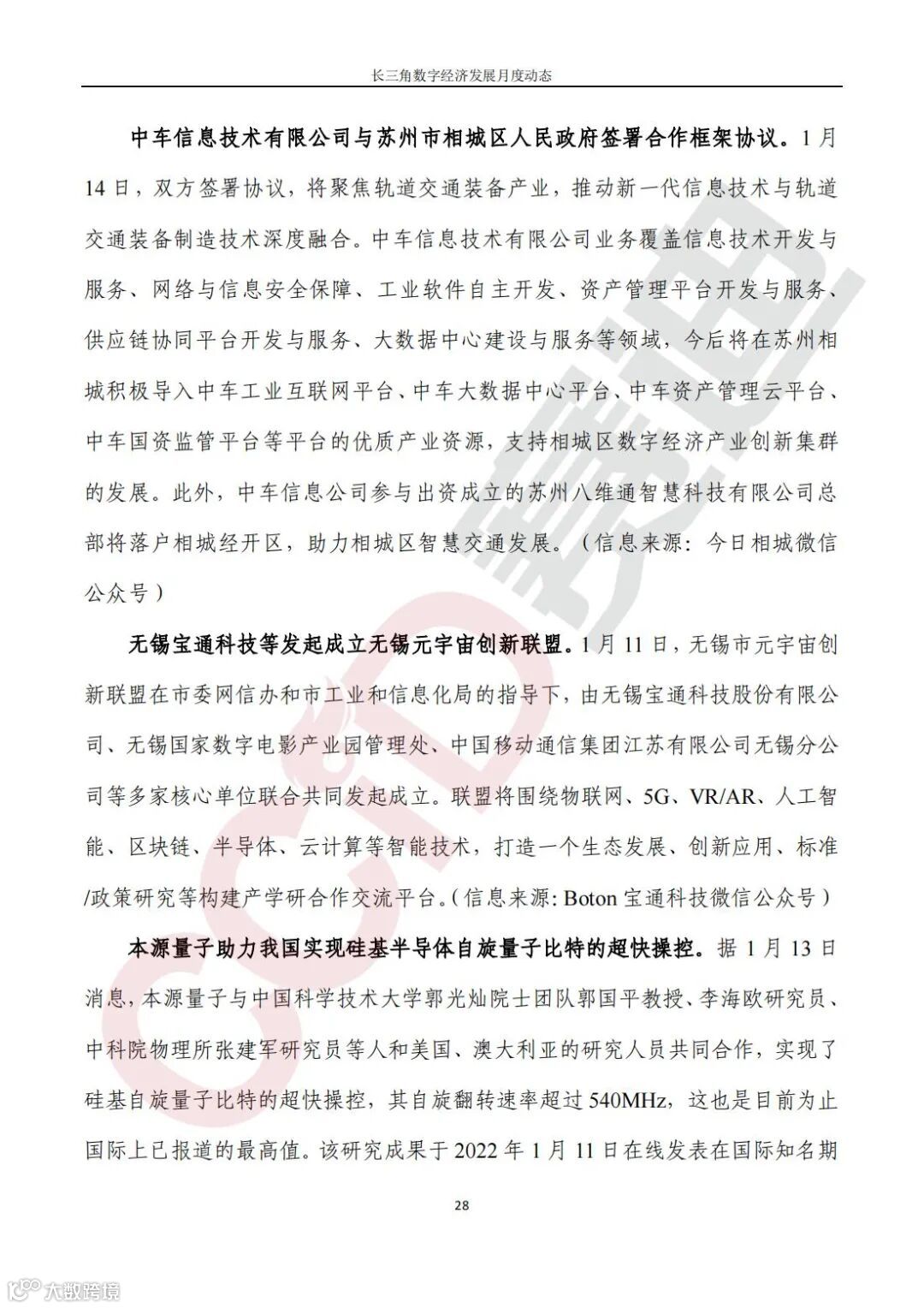 《长三角数字经济发展月度动态》2022年第1期来啦!本刊物由赛迪数字经济研究中心创办,重点聚焦《长江三角洲区域一体化发展规划纲要》中涵盖的27个中心区城市,以数字经济相关领域月度主要发展动态为主题,从数据洞察、政策汇集、行业观察、城市动态、长三角一体化、访谈讲话、赛迪观点等多个维度展现长三角数字经济的区域发展态势,进而为地方关切提供参考依据,助力地方经济社会发展。
