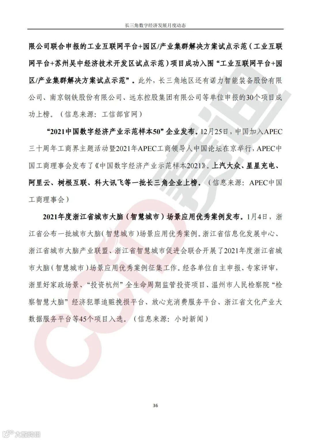 获奖情况,2021年工业互联网试点示范项目公示,长三角地区的诺力智能装备、南京钢铁、吴中经开区管委会、苏州赛迪公司、苏州浪潮云计算有限公司等单位申报的31个项目成功上榜;“2021中国数字经济产业示范样本50”企业发布,上汽大众、星星充电、阿里云、树根互联、科大讯飞等一批企业上榜;2021年度浙江省城市大脑(智慧城市)场景应用优秀案例发布。