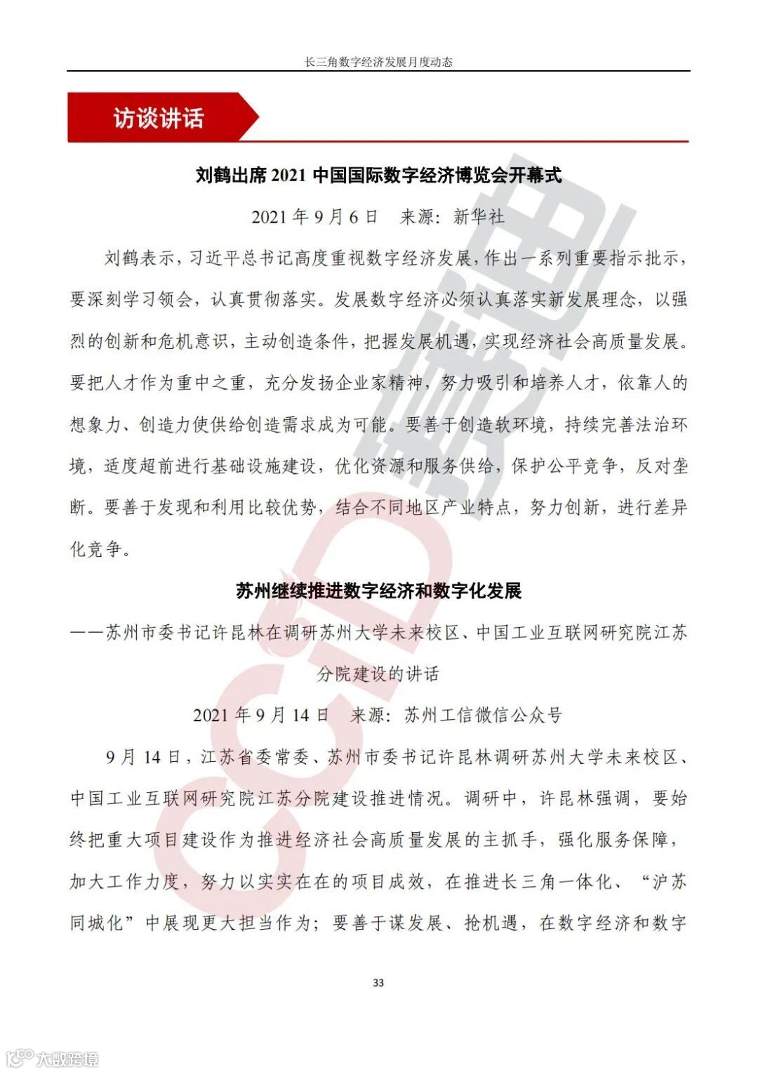 刘鹤出席 2021 中国国际数字经济博览会开幕式,刘鹤表示, 发展数字经济必须认真落实新发展理念,主动创造条件,把握发展机遇,要把人才作为重中之重,努力吸引和培养人才,要善于创造软环境,优化资源和服务供给,要善于发现和利用比较优势,进行差异化竞争。