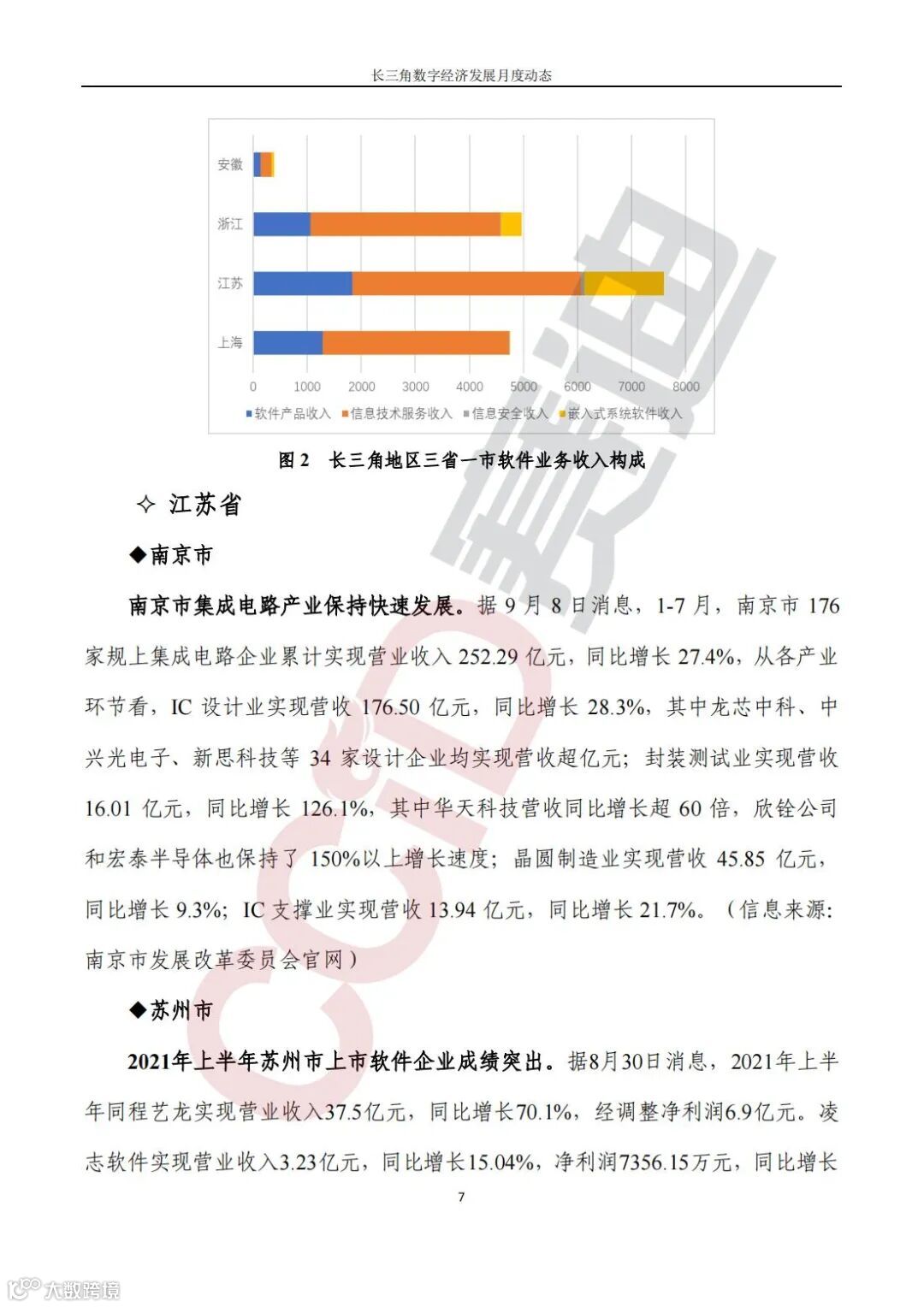 长三角三省一市积极打造数字经济发展高地。长三角地区1-8 月完成软件业务收入17704亿元,其中上海市软件收入合计4754亿元,同比增长24.5%,江苏省软件收入合计7600亿元,同比增长15.6%,浙江省软件收入合计4961亿元,同比增长12.5%,安徽省软件收入合计388亿元,同比增长30.5%;南京市176家规上集成电路企业1-7月累计实现营业收入252.29亿元,同比增长27.4%;苏州市同程艺龙、艾隆科技、麦迪科技等多家上市软件企业上半年增速超30%;浙江省2020年人工智能产业实现营业收入2693.43亿元,同比增长11.99%;金华市数字经济核心产业制造业规上工业增加值7月达到18.17亿元,同比增长64%,累计达到107.61亿元,同比增长77.7%;合肥市截至8月27日已累计建成117家智能工厂、1107个数字化车间,“万家企业登云”数量突破1.1万家。