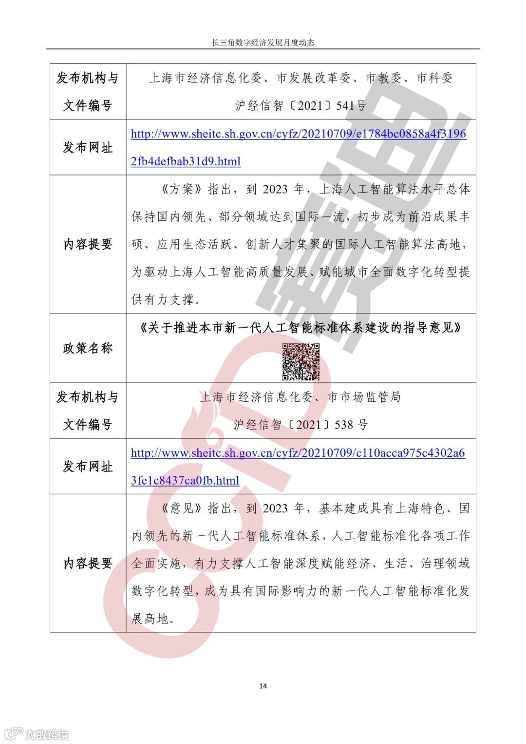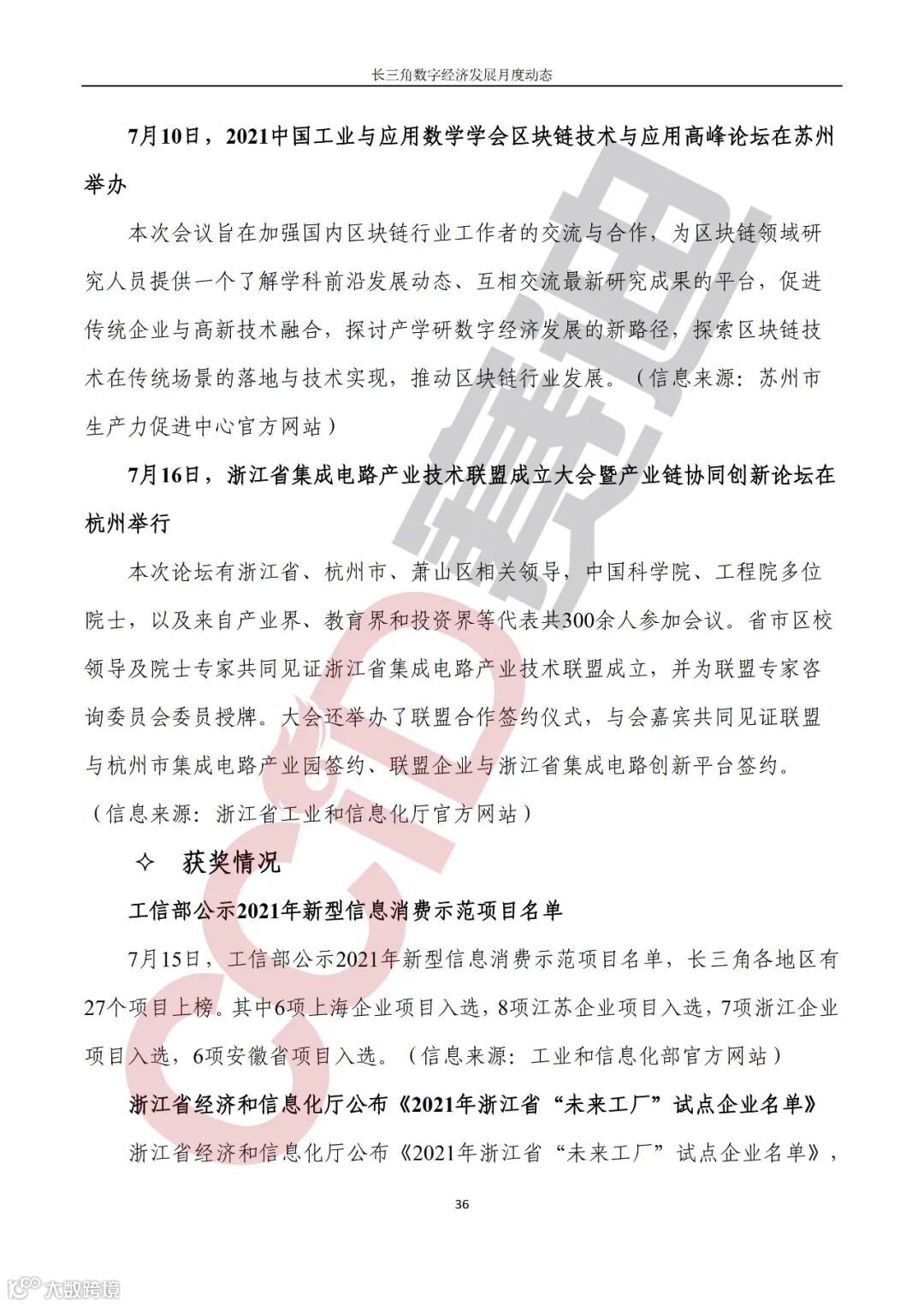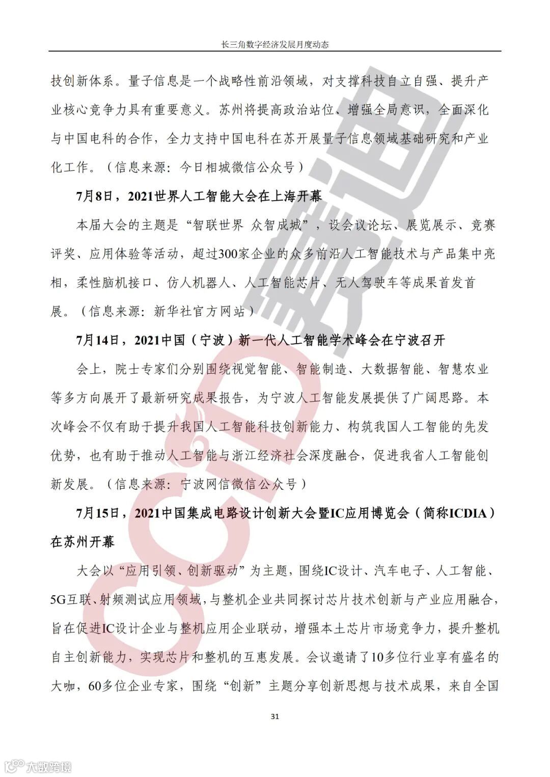 重要会议,数字产业化方面,建设长三角量子信息工程产业创新中心座谈会在苏州举行;2021世界人工智能大会在上海开幕;2021中国(宁波)新一代人工智能学术峰会在宁波召开;2021中国集成电路设计创新大会暨IC应用博览会(简称ICDIA)在苏州开幕。