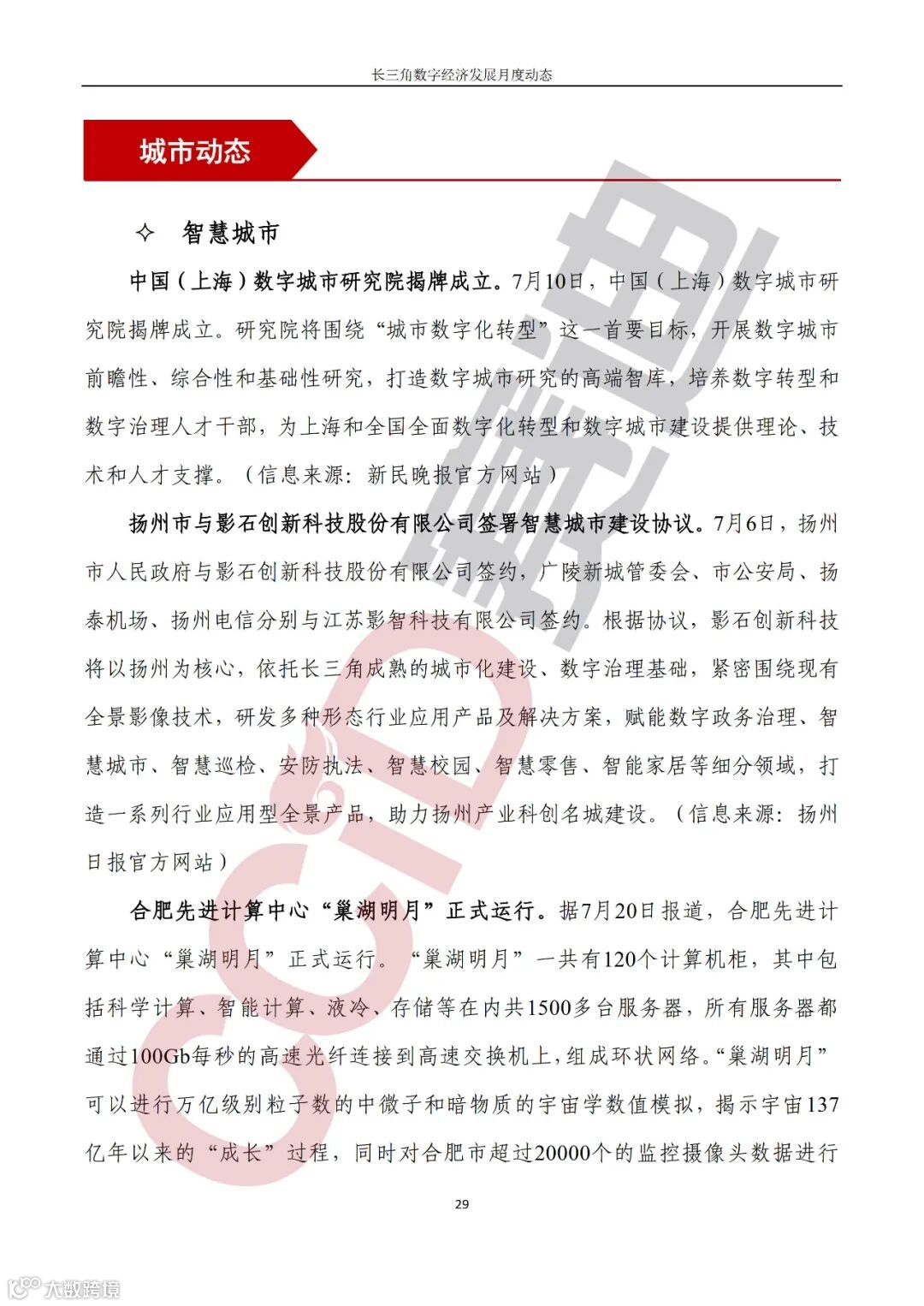 智慧城市,中国(上海)数字城市研究院揭牌成立;扬州市与影石创新签署智慧城市建设协议,助力扬州产业科创名城建设;合肥先进计算中心“巢湖明月”正式运行;安徽江淮大数据中心总平台正式上线;马鞍山市基层信息系统整合项目正式上线试运行。