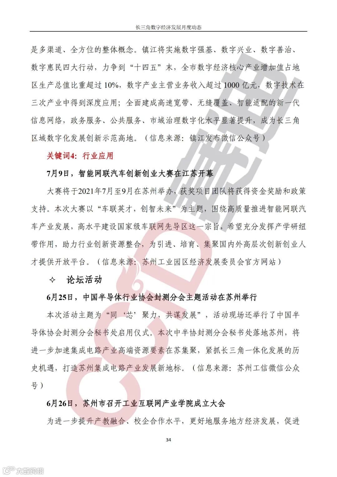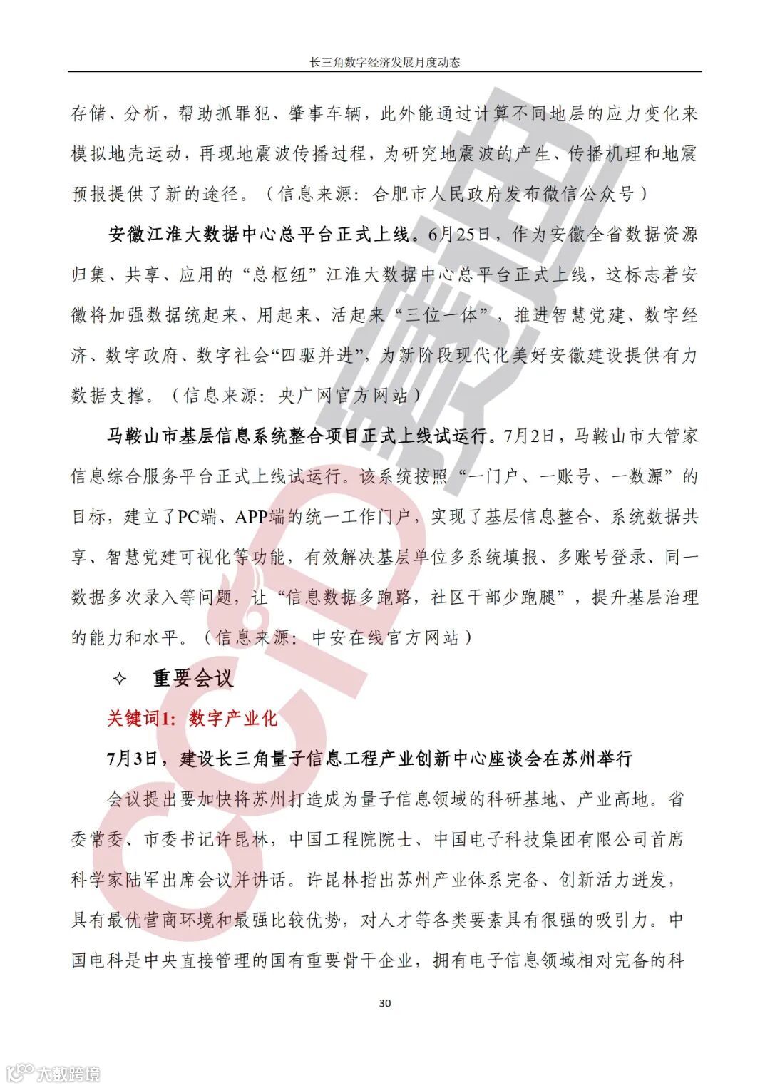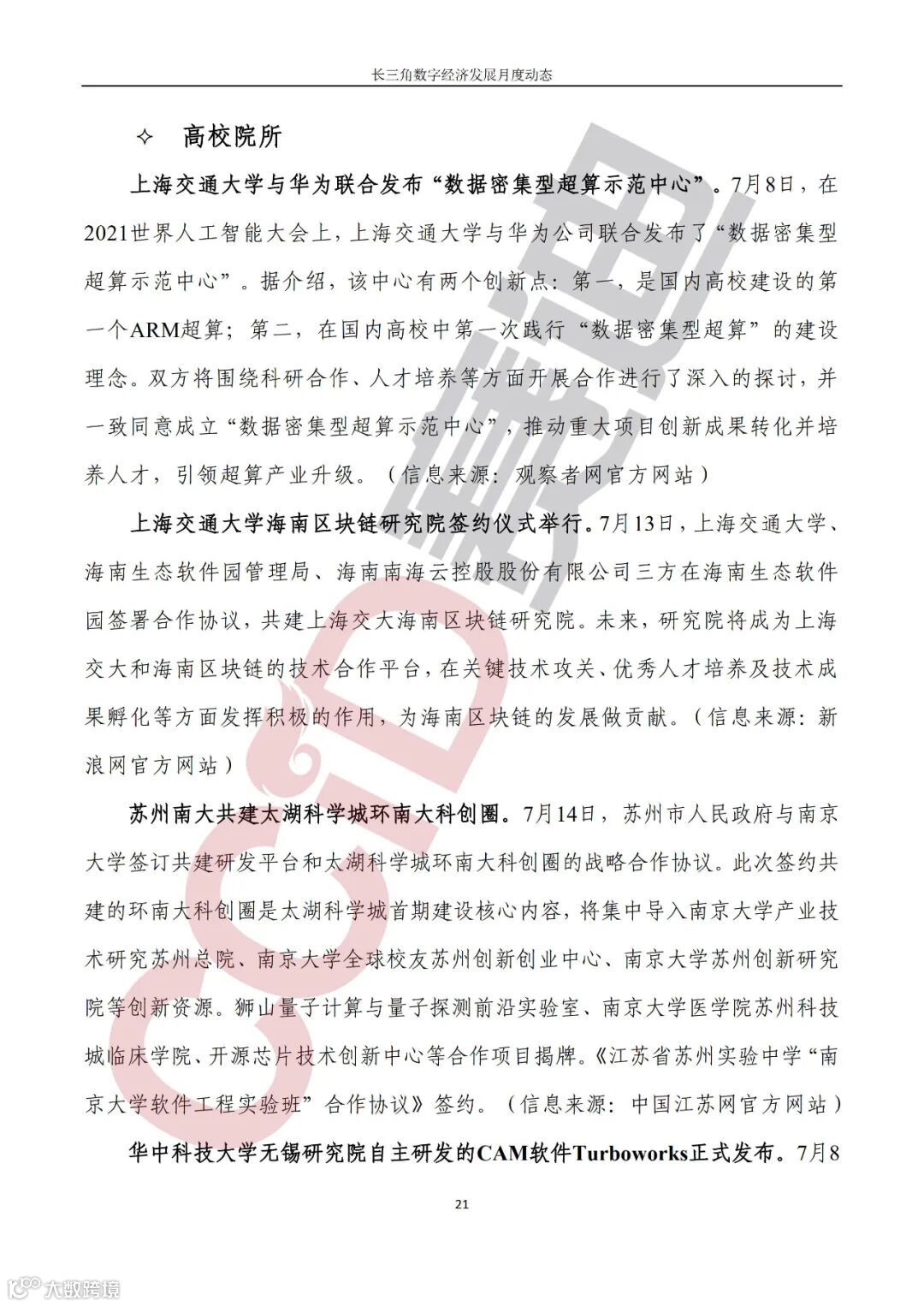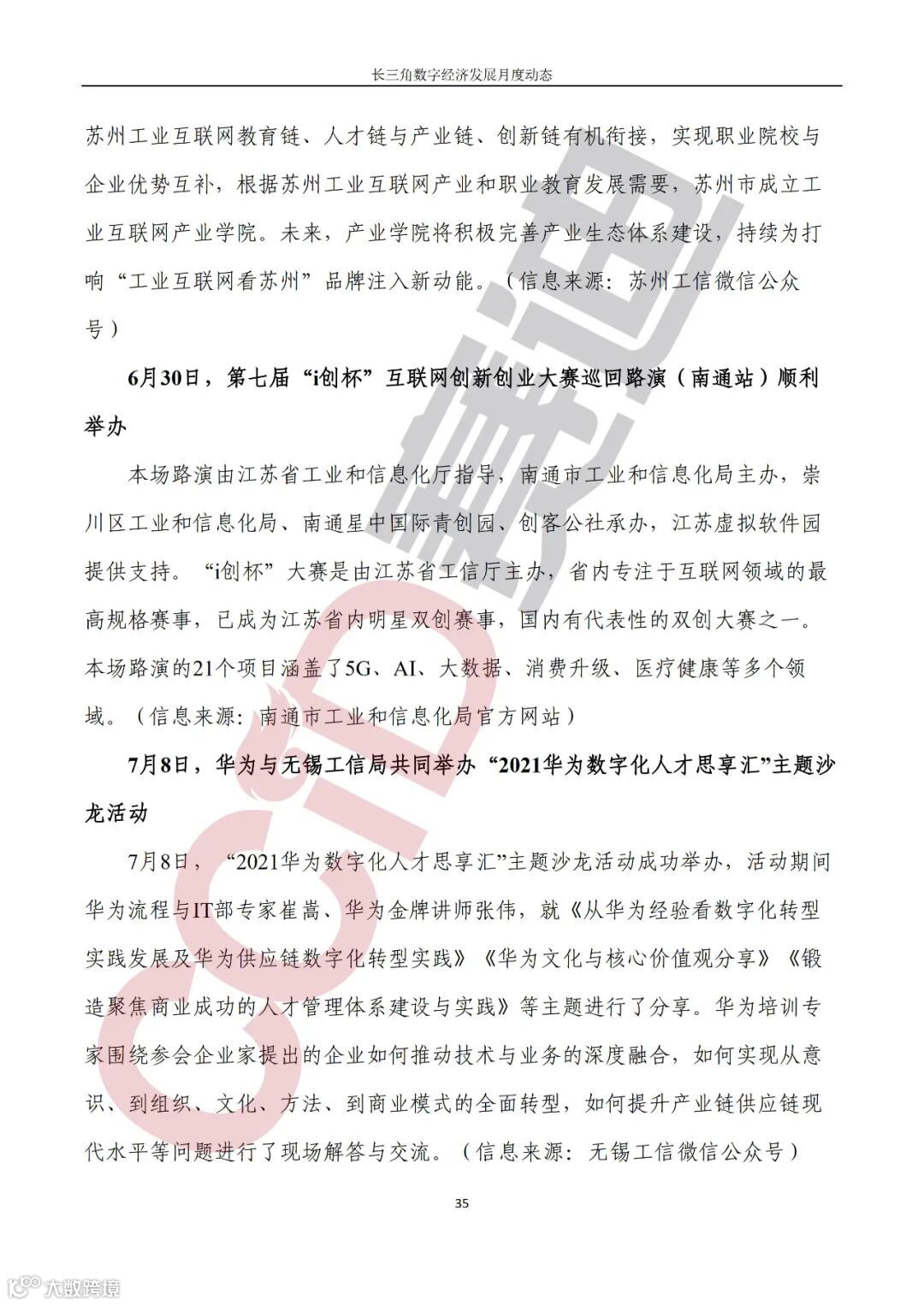 《长三角数字经济发展月度动态》2021年第7期来啦!本刊物由赛迪数字经济研究中心创办,重点聚焦《长江三角洲区域一体化发展规划纲要》中涵盖的27个中心区城市,以数字经济相关领域月度主要发展动态为主题,从数据洞察、政策汇集、行业观察、城市动态、长三角一体化、访谈讲话、赛迪观点等多个维度展现长三角数字经济的区域发展态势,进而为地方关切提供参考依据,助力地方经济社会发展。