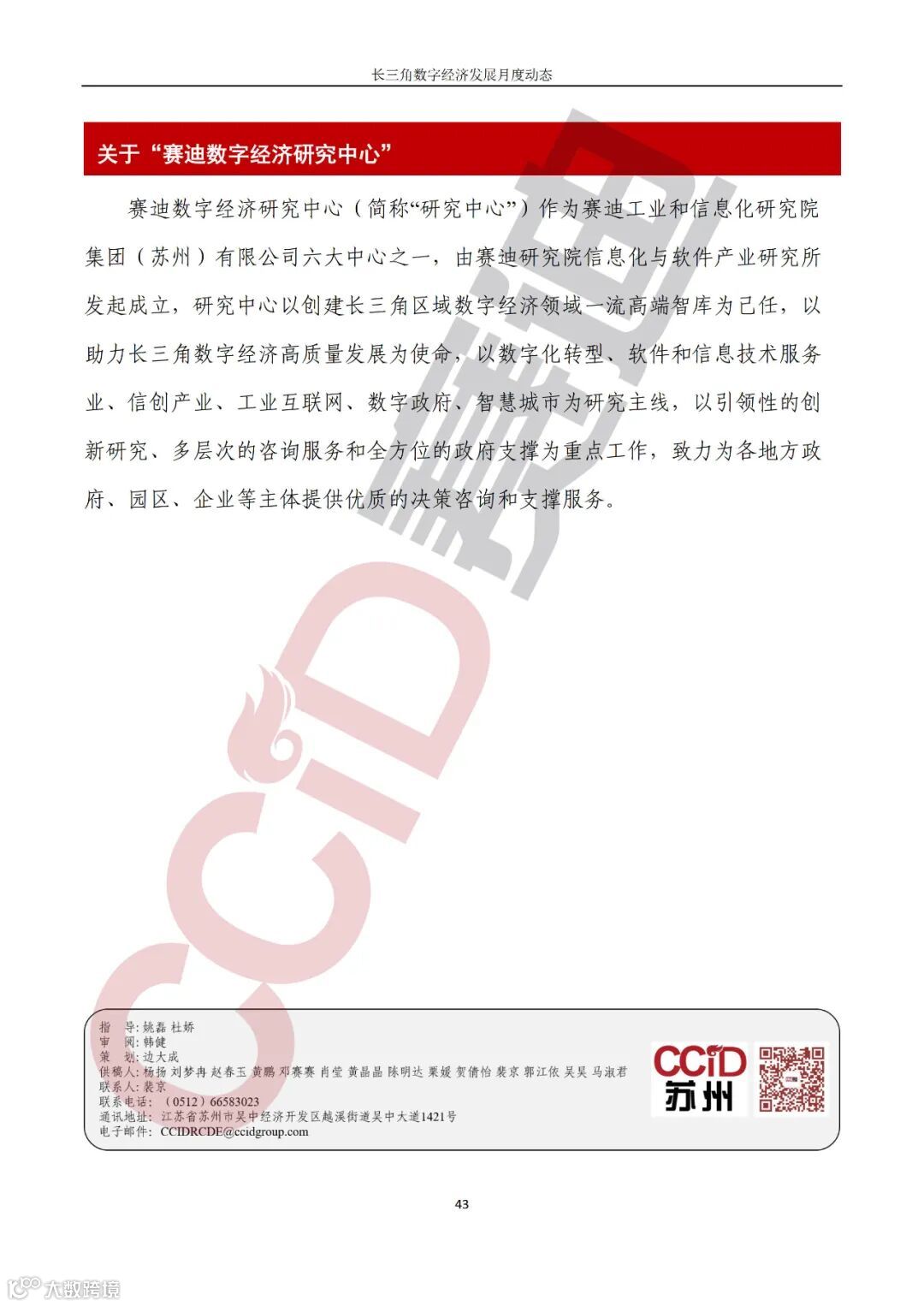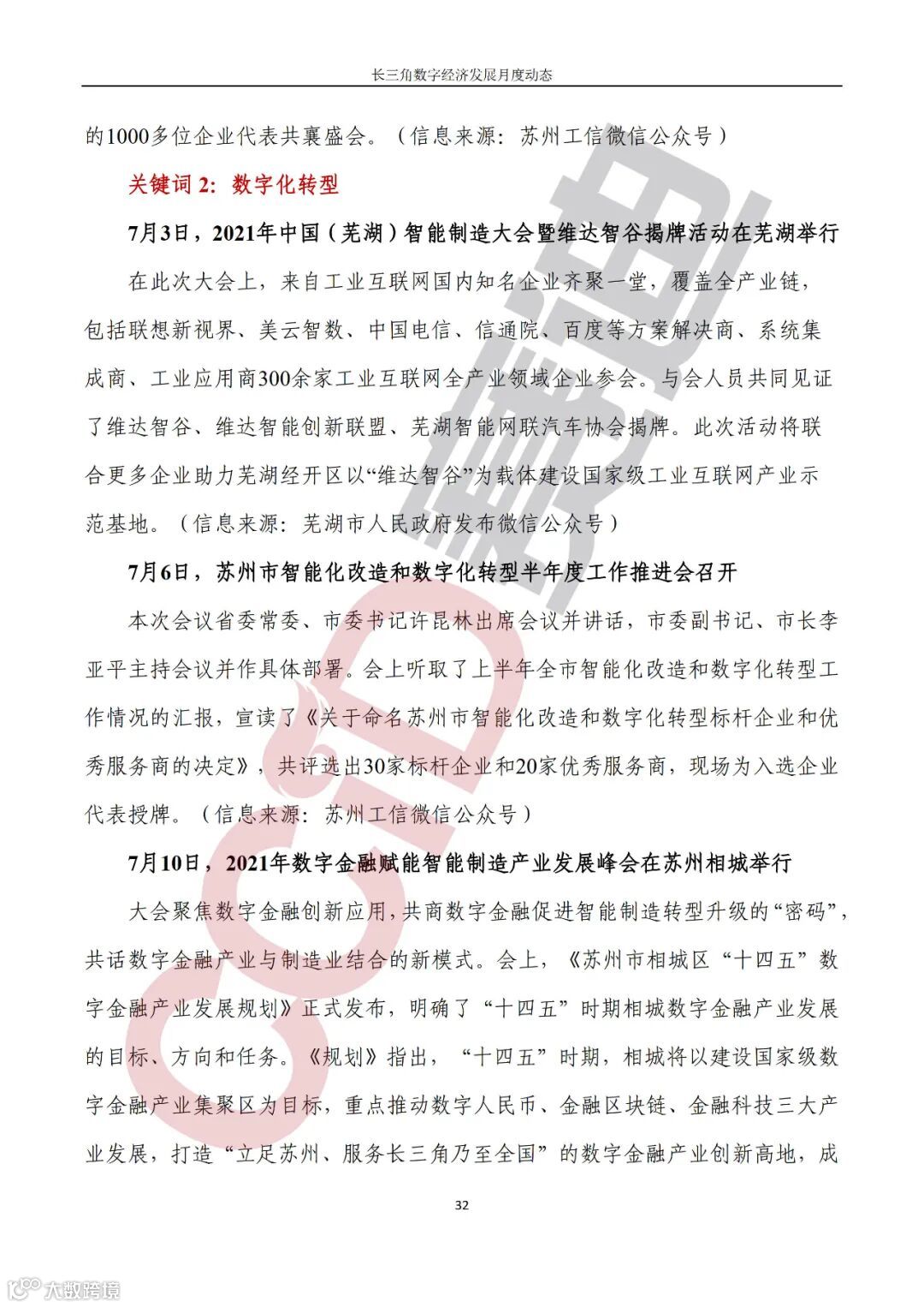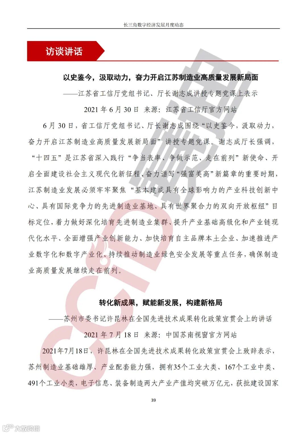 《长三角数字经济发展月度动态》2021年第7期来啦!本刊物由赛迪数字经济研究中心创办,重点聚焦《长江三角洲区域一体化发展规划纲要》中涵盖的27个中心区城市,以数字经济相关领域月度主要发展动态为主题,从数据洞察、政策汇集、行业观察、城市动态、长三角一体化、访谈讲话、赛迪观点等多个维度展现长三角数字经济的区域发展态势,进而为地方关切提供参考依据,助力地方经济社会发展。