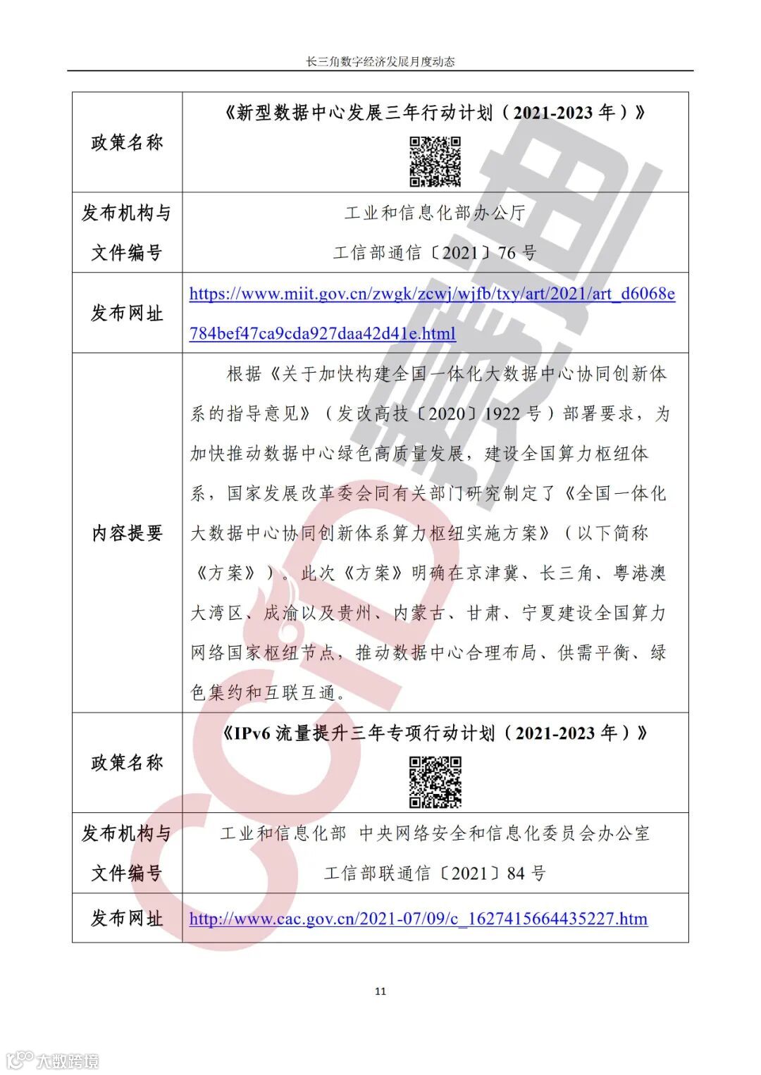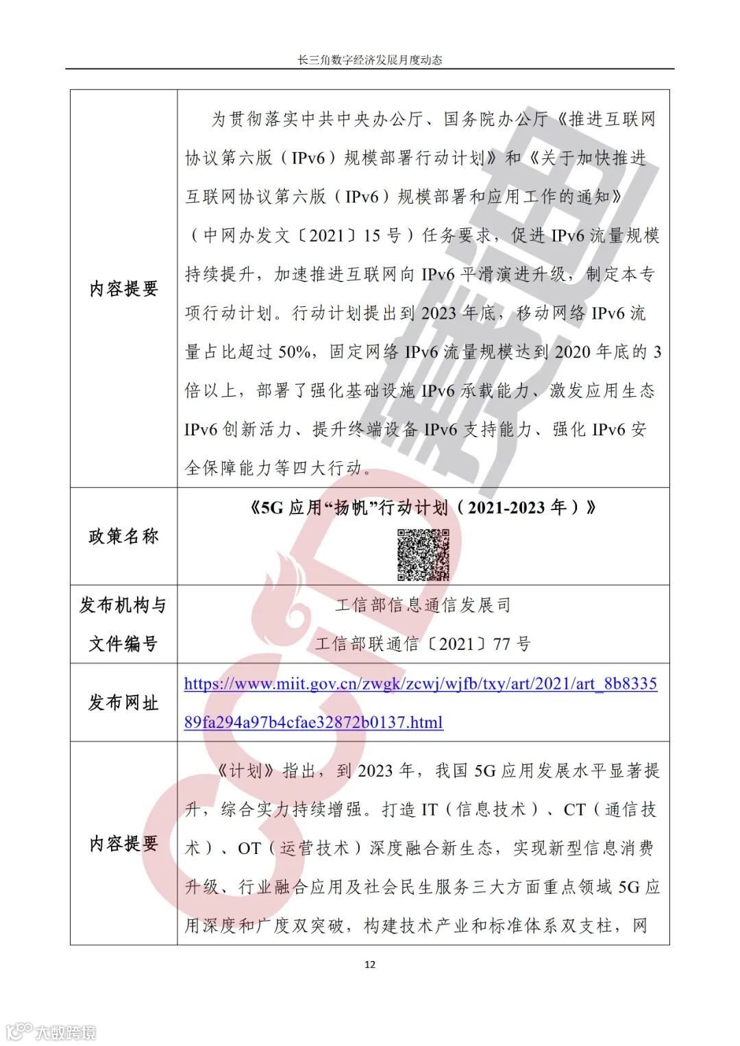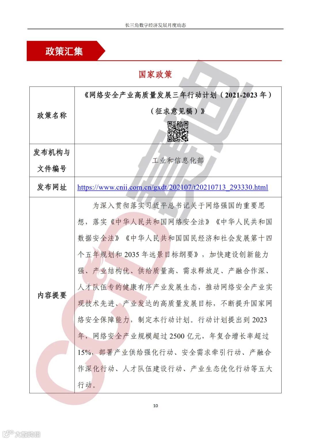 国家、长三角三省一市出台最新数字经济相关政策规划。工信部制定《网络安全产业高质量发展三年行动计划(2021-2023年)(征求意见稿)》,推动网络安全产业实现技术先进、产业发达的高质量发展目标。工信部出台《新型数据中心发展三年行动计划(2021-2023年)》加快推动数据中心绿色高质量发展。工信部发布《IPv6流量提升三年专项行动计划(2021-2023年)》促进IPv6流量规模持续提升,加速推进互联网向IPv6平滑演进升级。工信部制定《5G应用“扬帆”行动计划(2021-2023年)》,推动5G应用实现深度和广度双突破;长三角出台《长三角一体化发展规划“十四五”实施方案》,提出共同建设数字长三角,打造国际领先的信息枢纽新标杆、全球数字智能设施新高地;上海市出台《上海新一代人工智能算法创新行动计划(2021-2023年)》《关于推进本市新一代人工智能标准体系建设的指导意见》为驱动上海人工智能高质量发展、成为具有国际影响力的新一代人工智能标准化发展高地提供有力支撑;苏州市发出《关于进一步加快推进全市制造业智能化改造和数字化转型工作的通知》,加快制造业智能化改造和数字化转型;浙江省人民政府分别印发《浙江省全球先进制造业基地建设“十四五”规划》《浙江省数字经济发展“十四五”规划》,提出“十四五”期间,全球先进制造业基地建设要取得重大进展,到2025年,数字经济增加值占GDP比重达到60%左右。浙江省发展和改革委员会发布《浙江省农业农村现代化“十四五”规划》提出建设国家数字农业应用推广基地、数字农业先导区。宁波市发改委与市委网信办联合印发《宁波市信息化发展“十四五”规划》,提出到2025年宁波网络强市、数字化改革、智慧城市建设要走在全国前列。《宁波市数字政府建设“十四五”规划》发布,提出要建立“整体智治、唯实惟先”的现代政府;安徽省发布《支持中国声谷创新发展若干政策》《中国声谷创新发展三年行动计划(2021—2023年)》,助力中国声谷建设。