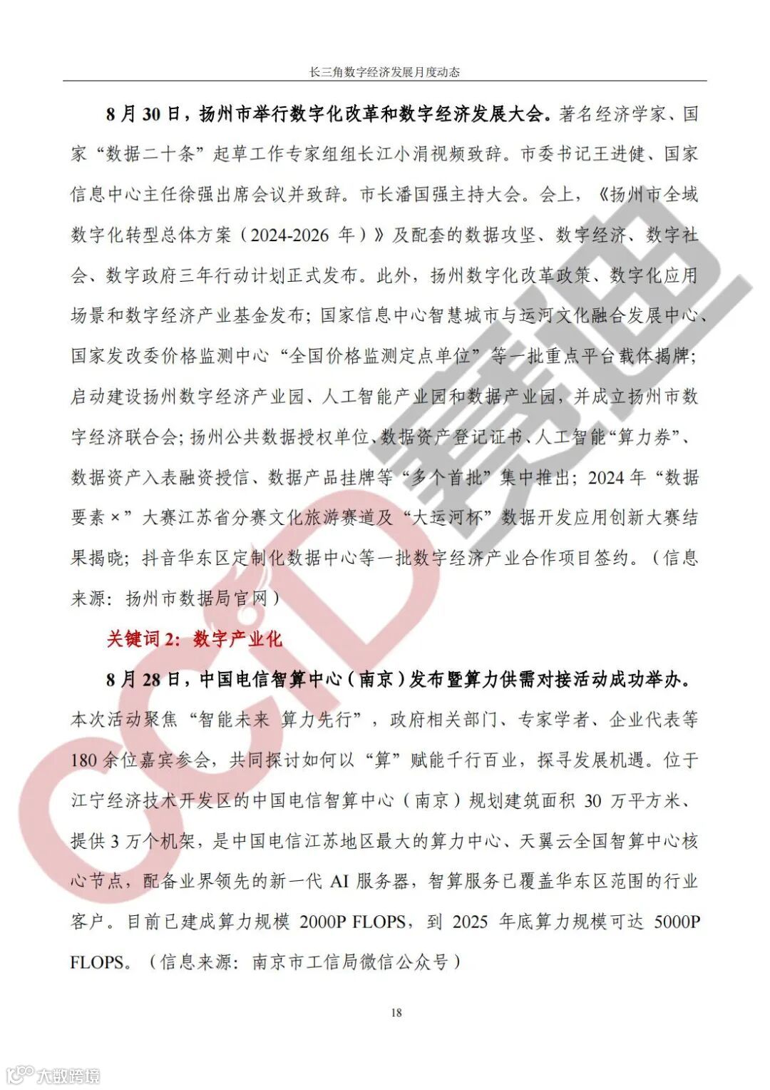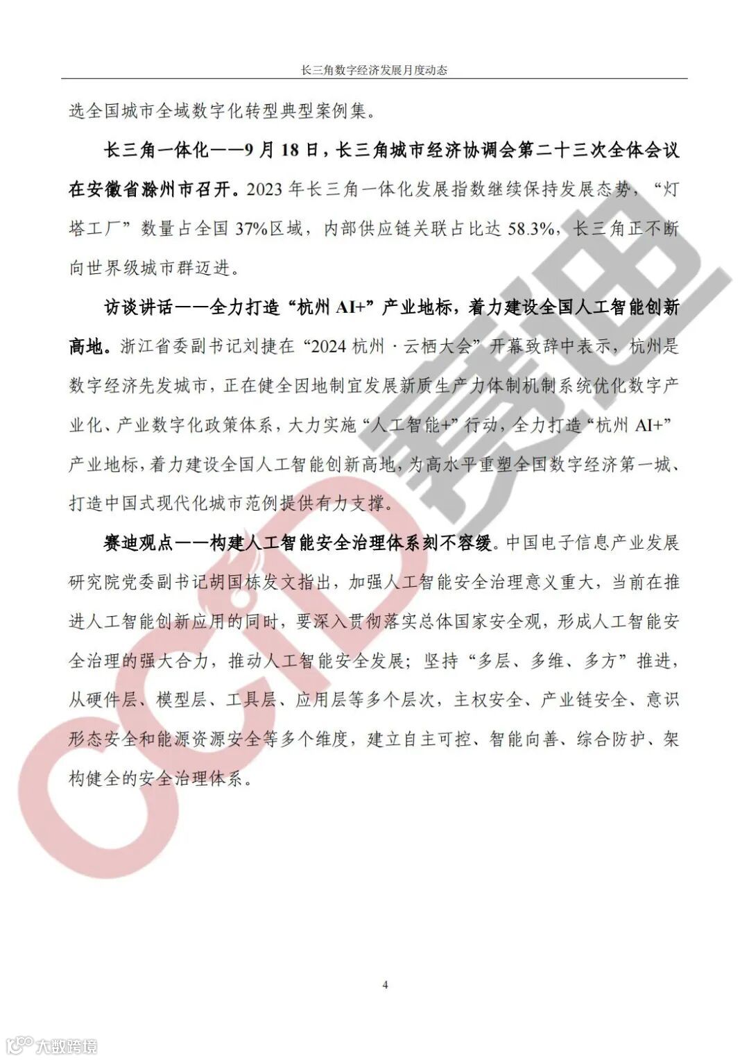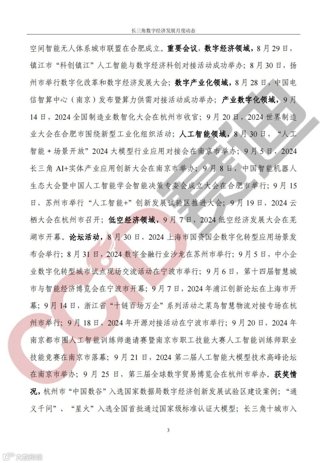 重要会议,数字经济领域,8月29日,镇江市“科创镇江”人工智能与数字经济科创对接活动成功举办;8月30日,扬州市举行数字化改革和数字经济发展大会;数字产业化领域,8月28日,中国电信智算中心(南京)发布暨算力供需对接活动成功举办;产业数字化领域,9月14日,2024全国制造业数智化大会在杭州市收官;9月20日,2024世界制造业大会在合肥市围绕新型工业化组织活动;人工智能领域,8月30日,“人工智能+场景开放”2024大模型行业应用对接会在南京市举办;9月5日,2024长三角AI+实体产业应用创新大会在南京市举办;9月8日,中国智能机器人生态大会暨中国人工智能学会智能决策专委会成立大会在合肥市举行;9月15日,苏州市举行“人工智能+”创新发展试验区推进大会;9月19日,2024云栖大会在杭州市召开;低空经济领域,9月7日,2024低空经济发展大会在芜湖市开幕。