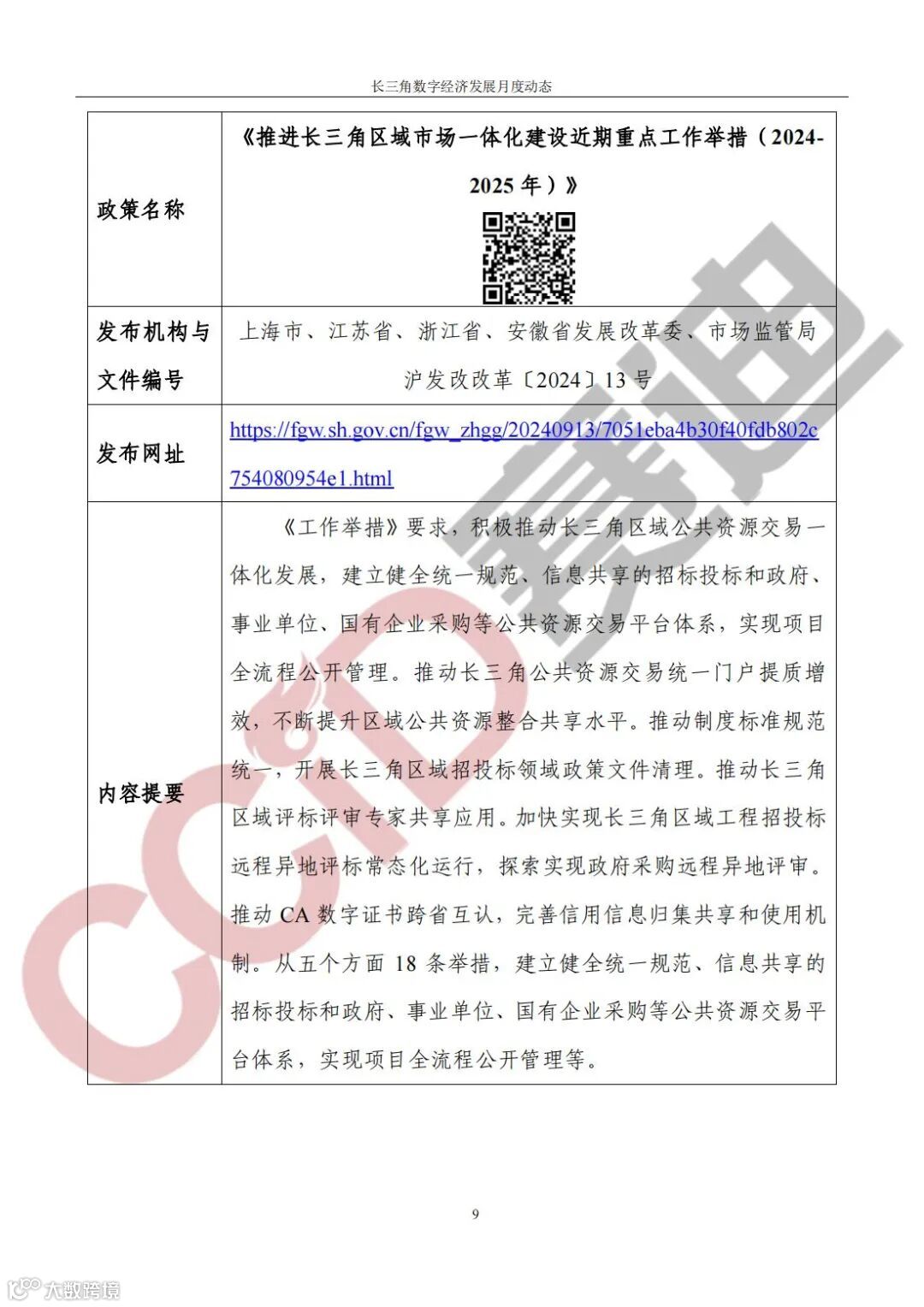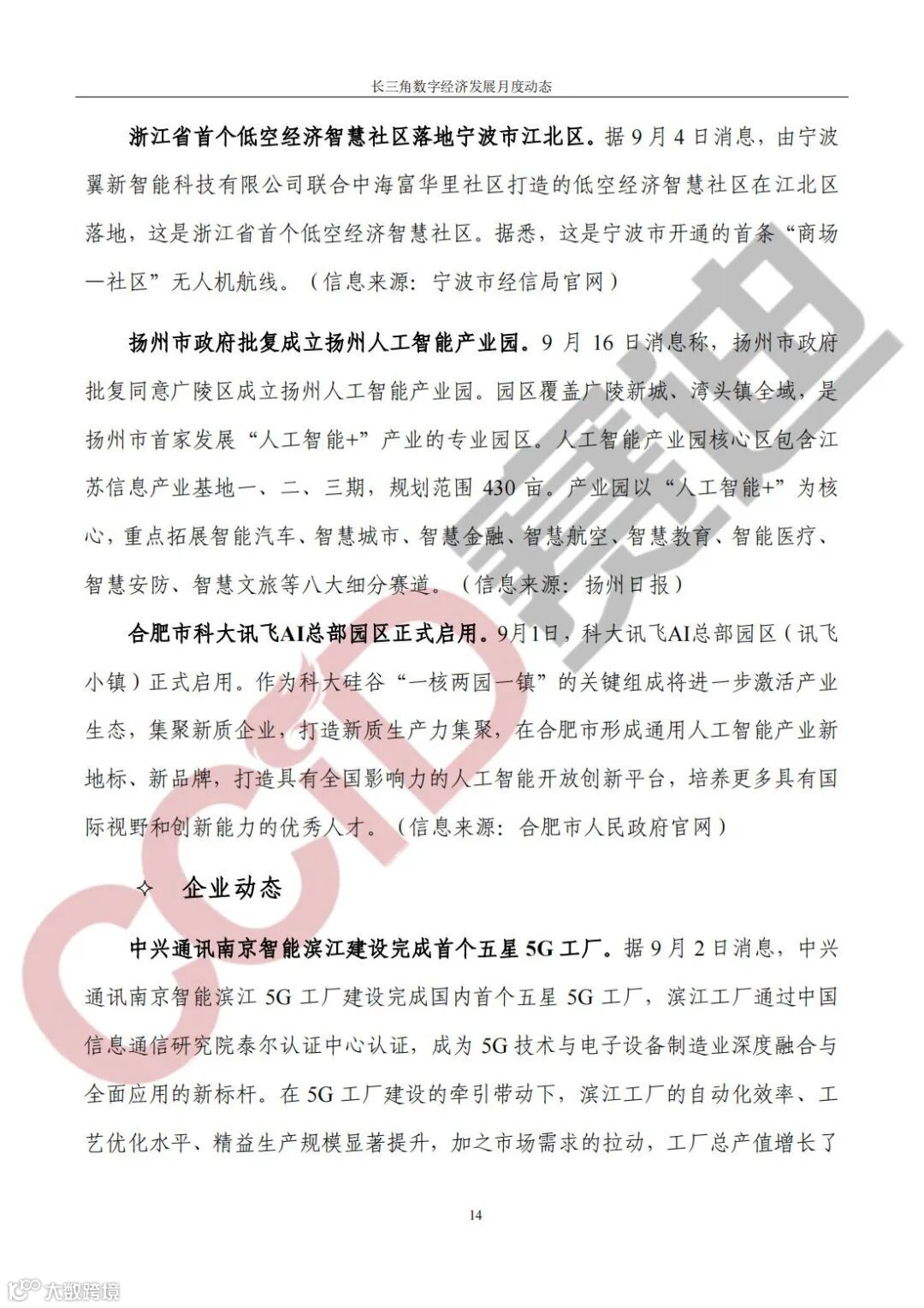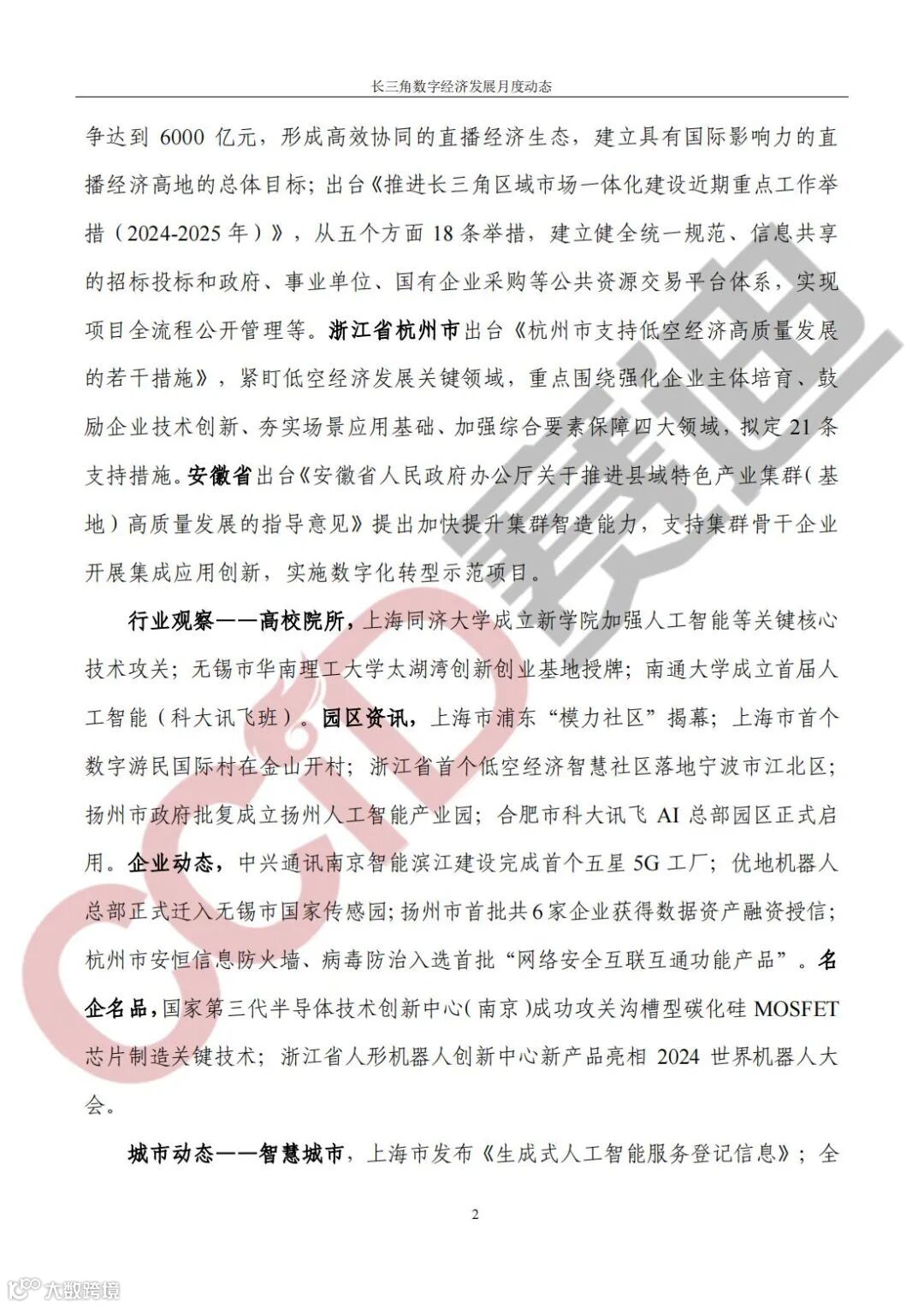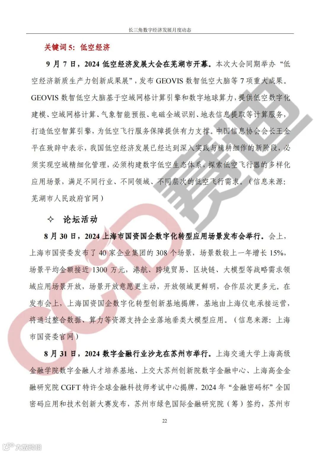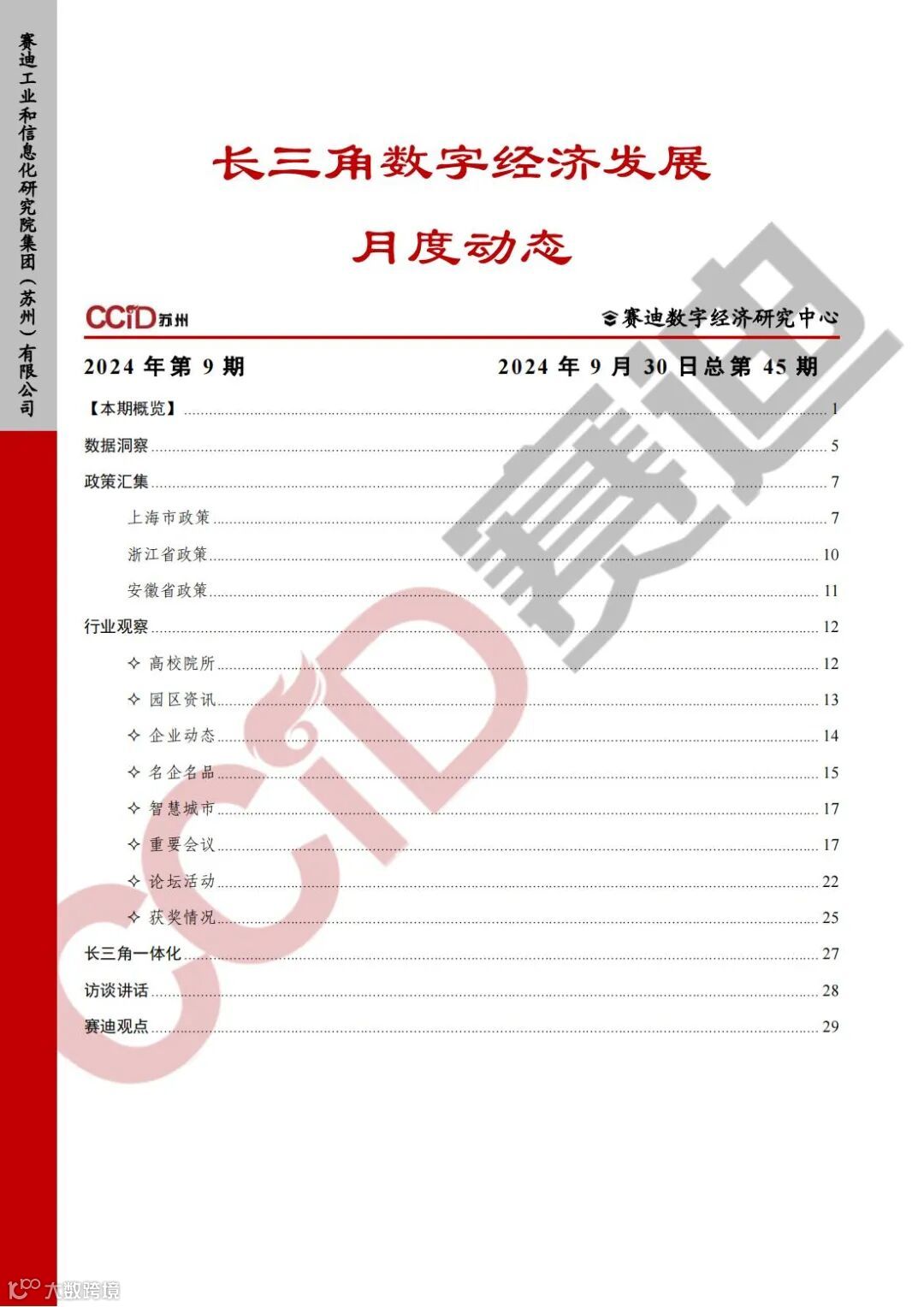《长三角数字经济发展月度动态》2024年第9期来啦!本刊物由赛迪数字经济研究中心创办,重点聚焦《长江三角洲区域一体化发展规划纲要》中涵盖的27个中心区城市,以数字经济相关领域月度主要发展动态为主题,从数据洞察、政策汇集、行业观察、城市动态、长三角一体化、访谈讲话、赛迪观点等多个维度展现长三角数字经济的区域发展态势,进而为地方关切提供参考依据,助力地方经济社会发展。