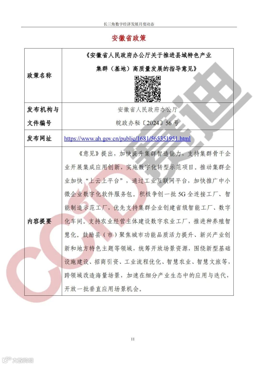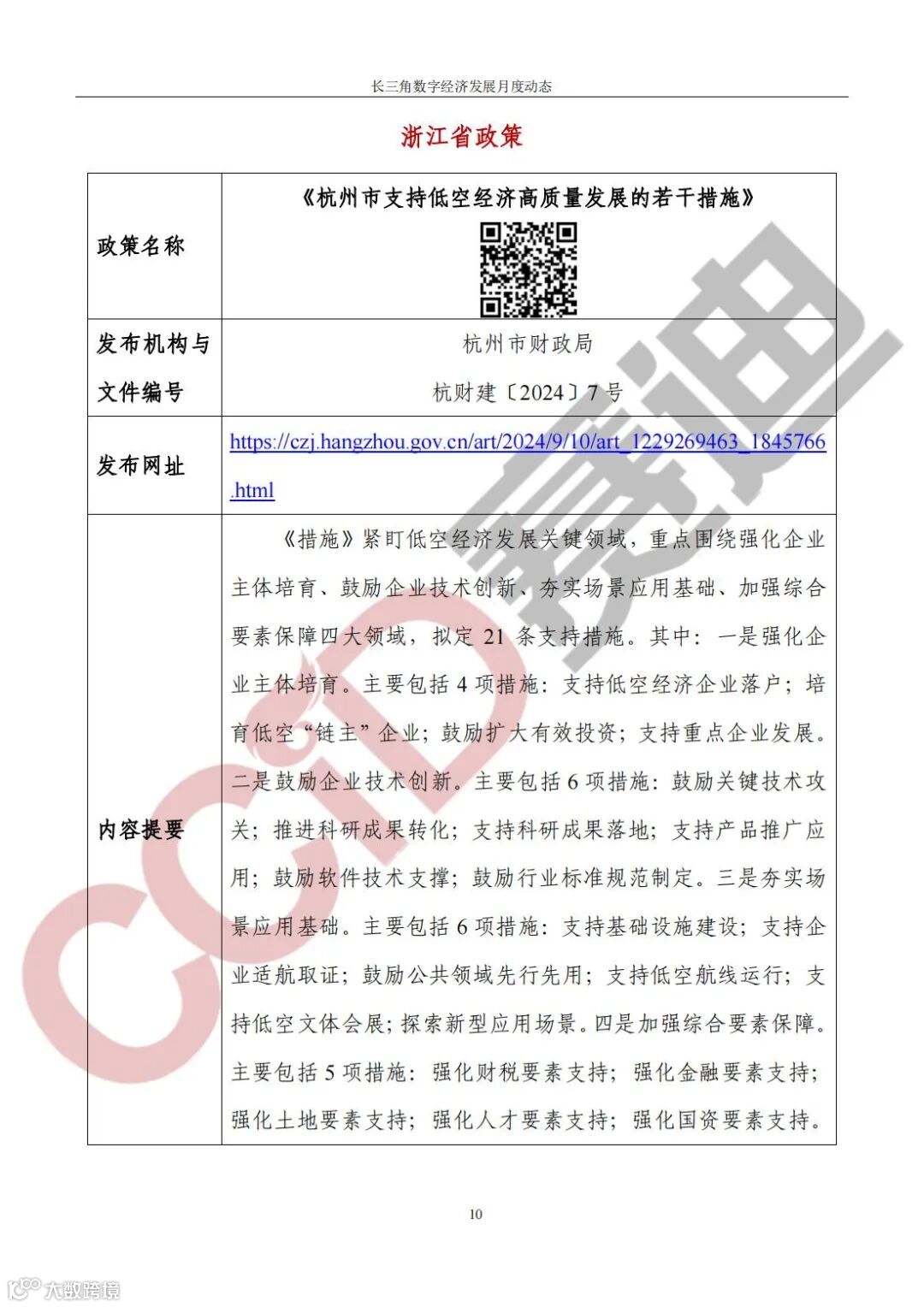 上海市出台《上海高质量推进全球金融科技中心建设行动方案》,以人工智能、云原生、区块链、隐私计算、量子计算等领域为技术主攻方向,推动金融科技底层技术基础研发和原始创新;发布《上海市推动直播经济高质量发展三年行动计划(2024-2026年)》,目标到2026年直播电商零售额力争达到6000亿元,形成高效协同的直播经济生态,建立具有国际影响力的直播经济高地的总体目标;出台《推进长三角区域市场一体化建设近期重点工作举措(2024-2025年)》,从五个方面18条举措,建立健全统一规范、信息共享的招标投标和政府、事业单位、国有企业采购等公共资源交易平台体系,实现项目全流程公开管理等。浙江省杭州市出台《杭州市支持低空经济高质量发展的若干措施》,紧盯低空经济发展关键领域,重点围绕强化企业主体培育、鼓励企业技术创新、夯实场景应用基础、加强综合要素保障四大领域,拟定21条支持措施。安徽省出台《安徽省人民政府办公厅关于推进县域特色产业集群(基地)高质量发展的指导意见》提出加快提升集群智造能力,支持集群骨干企业开展集成应用创新,实施数字化转型示范项目。