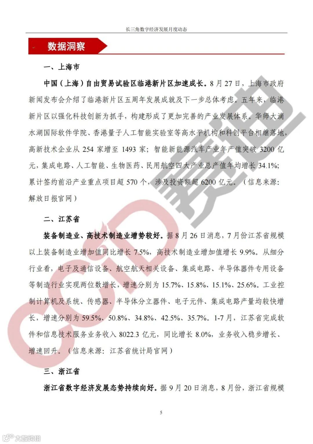 长三角数字经济发展各市稳质增量。上海市中国(上海)自由贸易试验区临港新片区加速成长,五年来,高新技术企业从254家增至1493家;智能新能源汽车产业年产值突破3200亿元,集成电路、人工智能、生物医药、民用航空四大产业总产值年均增长34.1%;累计签约前沿产业重点项目超570个,涉及投资额超6200亿元。江苏省装备制造业、高技术制造业增势较好,7月份,江苏省规模以上装备制造业增加值同比增长7.5%,高技术制造业增加值增长9.9%;1-7月,江苏省完成软件和信息技术服务业务收入8022.3亿元,同比增长8.0%,业务收入稳步增长、增速回升。浙江省数字经济发展态势持续向好,8月份,浙江省规模以上工业中,数字经济产业增加值增长6.1%;1-7月,规模以上服务业中,信息传输软件和信息技术服务业营业收入增长7.5%。杭州市1-7月规模以上服务业(不含批发零售业、住宿餐饮业、金融业和房地产开发业)营业收入11424亿元,同比增长6.7%,其中信息传输、软件和信息技术服务业营业收入增长8.0%。安徽省“数智”赋能企业高质量发展,目前共有1.91万家规上企业启动了数字化转型、占全部规上工业企业八成以上,其中1.17万家实现了数字化改造、占全部规上工业企业五成以上;累计打造全球“灯塔工厂”5个、居全国第3位,培育国家级智能制造示范工厂20个、居全国第2位,培育国家级5G工厂19个、居全国第4位,培育国家级“双跨”工业互联网平台3个、国家级特色平台22个,均居全国第5位。